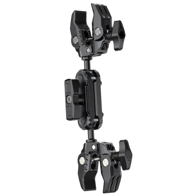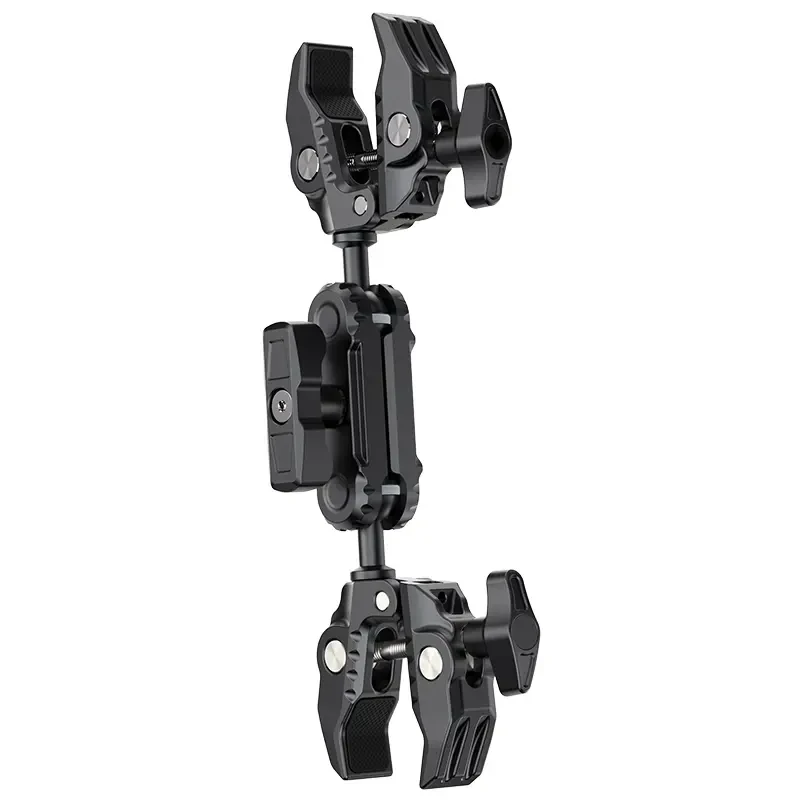 Ulanzi CO17 Super Clamp con rótula doble Magic Arm. Esta superpinza universal se fija fácilmente a motocicletas, bicicletas, trípodes, mesas y otros soportes. Su diseño antideslizante garantiza una sujeción segura en superficies con un ancho de entre 0,47 y 2,28 pulgadas. El cabezal esférico doble ofrece un ajuste flexible de 360°, lo que permite ángulos de captura versátiles. Los cabezales esféricos son intercambiables, lo que amplía las posibilidades de uso, con una capacidad de carga de 3,5 kg. Está fabricada en una aleación de aluminio ligera pero resistente, por lo que es ideal tanto para viajar como para el uso diario. Super Clamp para una flexibilidad extraordinaria.