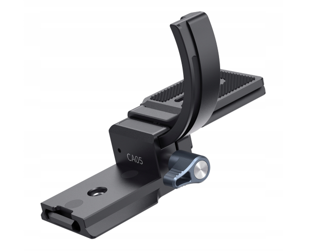 Gracias a la altura ajustable de la plataforma, el CA05 se adapta fácilmente a diferentes diseños de objetivos, mientras que el diseño semicircular del collar permite su instalación sin necesidad de retirar el objetivo de la cámara. Este soporte, fabricado en aluminio y acero resistentes, soporta equipos de hasta 5 kg, pero sigue siendo impresionantemente ligero para configuraciones portátiles.