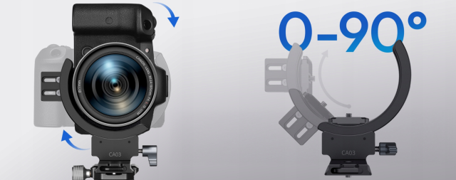 El mecanismo giratorio integrado permite cambiar suavemente entre la orientación horizontal y vertical sin tener que retirar la cámara del trípode. El gran botón de bloqueo ergonómico permite una rotación rápida y precisa con un mínimo esfuerzo, lo que ahorra tiempo en la fotografía dinámica.