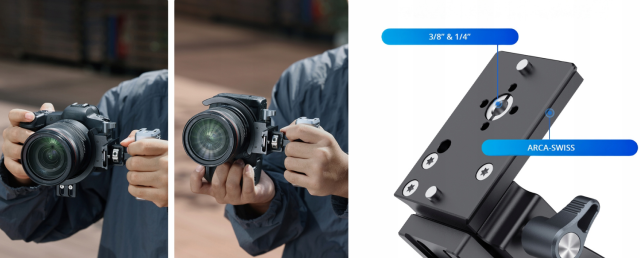 La placa integrada compatible con Arca-Swiss permite una fijación rápida a la mayoría de cabezales de trípode, sliders y gimbals. Para una mayor compatibilidad, la base también incluye roscas de 1/4"-20 y 3/8"-16, lo que la hace adecuada para una amplia gama de soportes.