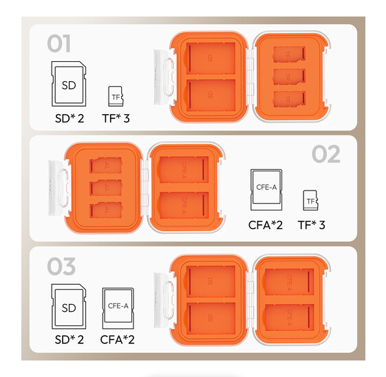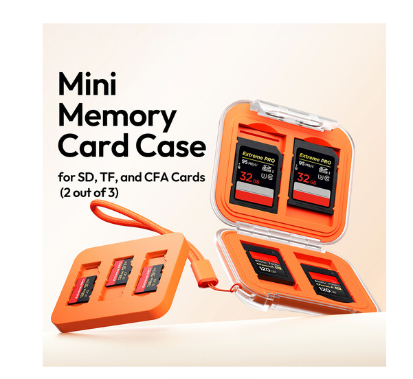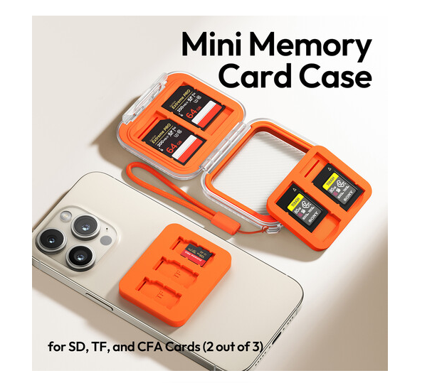 El estuche para tarjetas de memoria Ulanzi C055 CC01 Mini ofrece una solución compacta y resistente para guardar y proteger tarjetas SD, microSD y CFexpress. Gracias a sus separadores de silicona extraíbles, su exterior de policarbonato resistente a los golpes, su resistencia a las salpicaduras de agua y al polvo, y el cordón incluido para facilitar su transporte, este estuche mantiene tus tarjetas de memoria bien organizadas y a salvo.