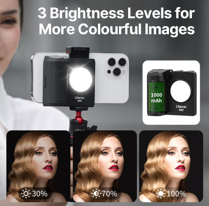 El soporte para cámara de smartphone Ulanzi CG-02 es un soporte de mano universal con luz auxiliar integrada y control remoto por Bluetooth. Está diseñado para fotografiar con una sola mano y mejora la estabilidad, la iluminación y el control, lo que lo hace ideal para vlogs, retransmisiones en directo y fotografía móvil.