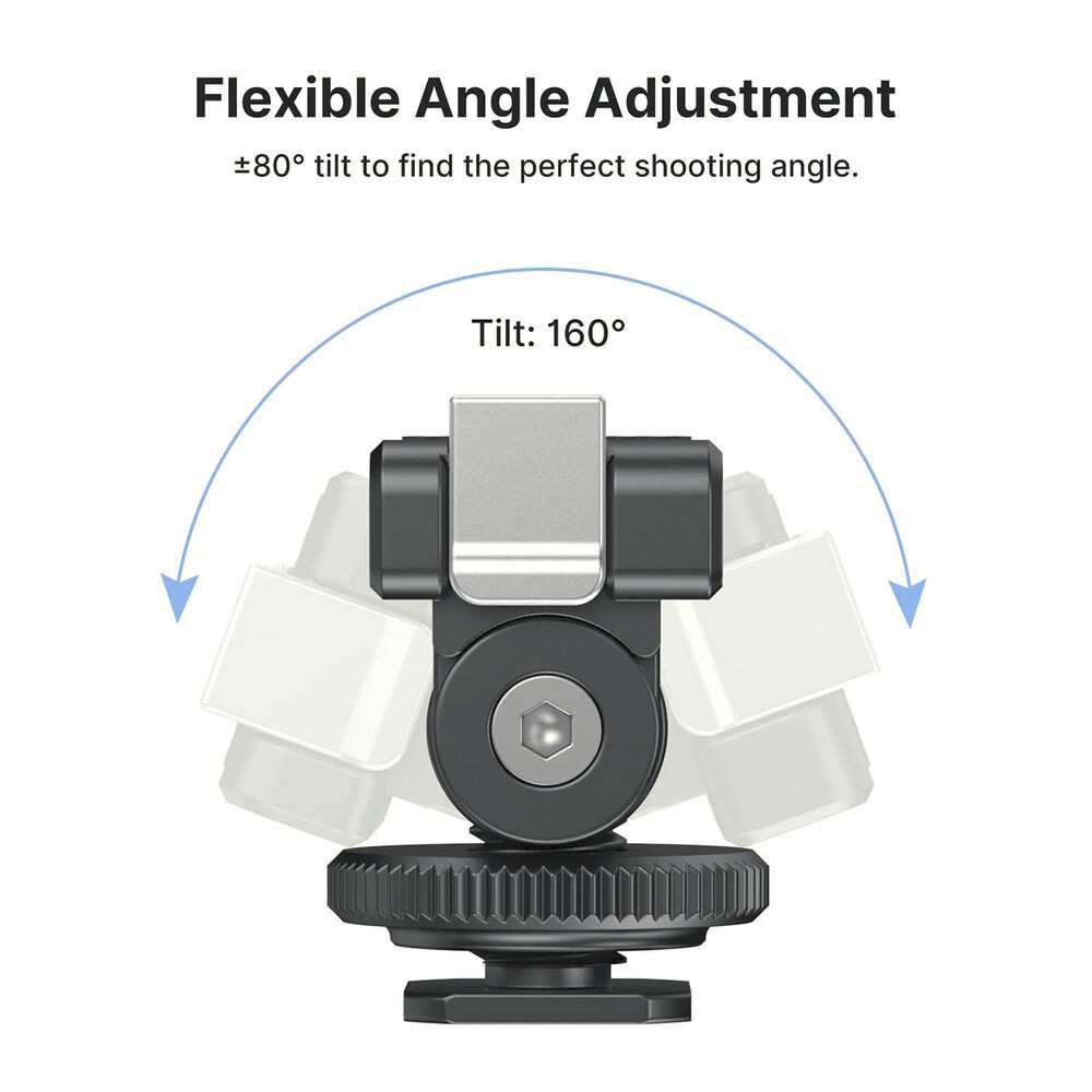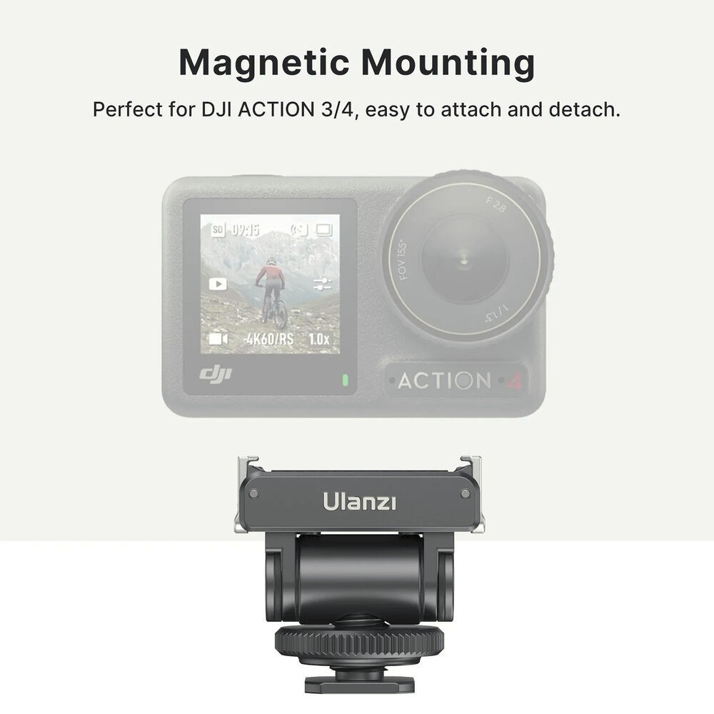 El adaptador Ulanzi Cold Shoe Mount para DJI Osmo Action 3/4 y Pocket 3 cuenta con una base magnética, una estructura de aluminio resistente y un ajuste de inclinación de 160°, lo que permite una fijación flexible y segura en zapatas, jaulas y soportes para cámaras.