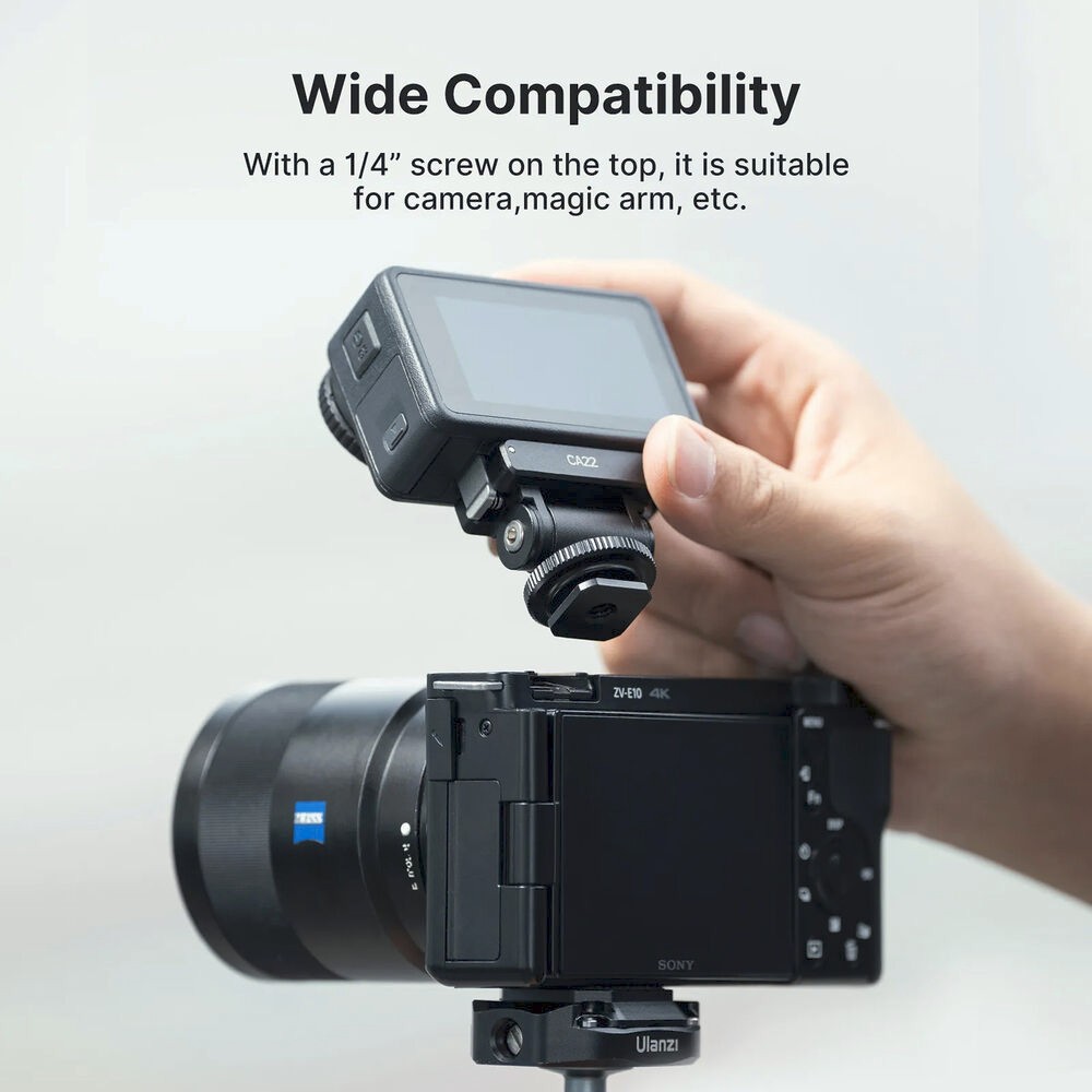 El adaptador Ulanzi Cold Shoe Mount es una solución de fijacióncompacta y resistente, diseñada específicamente para la DJI Osmo Action 3, Action 4 y Osmo Pocket 3, en combinación con el adaptador Ulanzi Expansion Adapter compatible (se vende por separado). Permite a los creadores fijar la cámara directamente a la zapata fría, lo que resulta ideal para su uso con jaulas de cámara, brazos mágicos, micrófonos y dispositivos de iluminación.