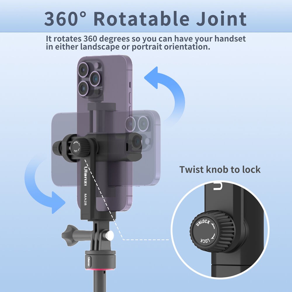 La abrazadera ajustable cuenta con mordazas de silicona y un botón de bloqueo que garantizan que tu teléfono permanezca firmemente en su sitio y, al mismo tiempo, esté protegido contra arañazos o daños. El soporte permite un giro de 360° y una inclinación de hasta 90°, lo que te permite cambiar rápidamente entre la orientación vertical y horizontal y ajustar con precisión el ángulo de visión.
