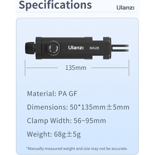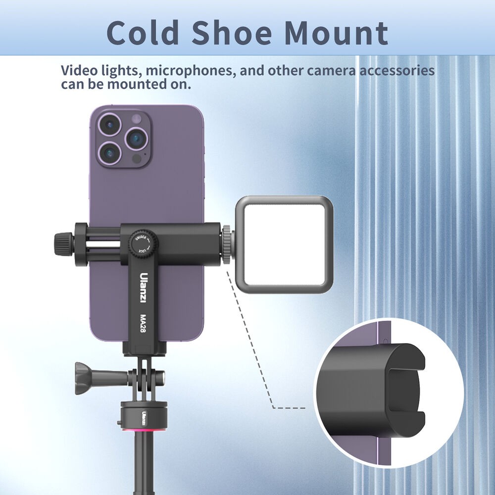 El soporte para teléfono Ulanzi MA28 GoPro Mount es una solución compacta y práctica para fijar un smartphone a soportes de cámaras de acción tipo GoPro, lo que lo hace ideal para vlogs, grabaciones en primera persona, retransmisiones en directo y la creación de contenido móvil. Está diseñado para admitir smartphones con un ancho de entre 2,2 y 3,7 pulgadas, lo que garantiza una amplia compatibilidad con la mayoría de los teléfonos modernos.