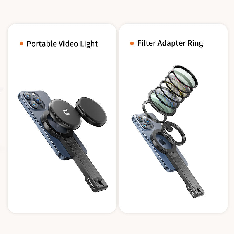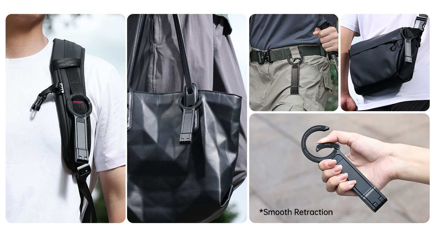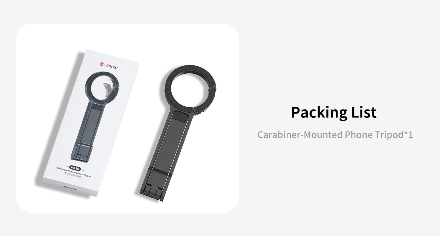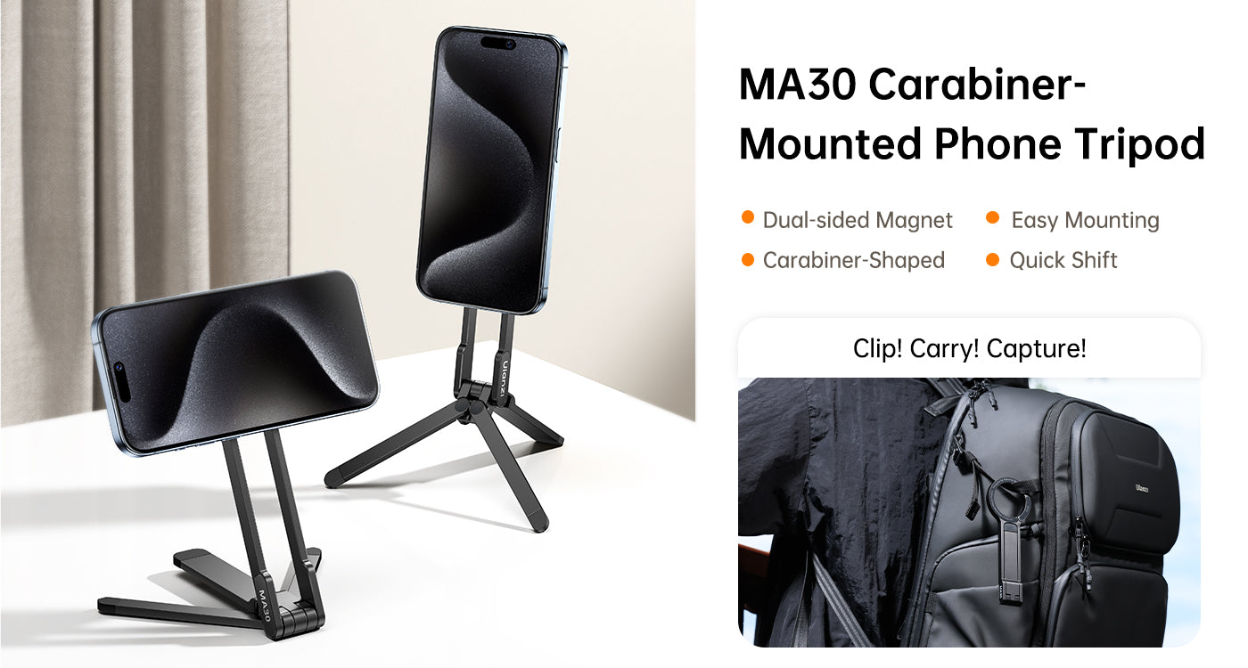 Trípode para móvil Ulanzi MA30 con mosquetón: compatible con MagSafe, ultraportátil e ideal para creadores. Cuelga, inclina, fotografía. El Ulanzi MA30 es un trípode para móvil con forma de mosquetón diseñado para creadores que necesitan una configuración rápida, ángulos flexibles y una gran portabilidad. Tanto si grabas un vlog mientras viajas como si filmas en espacios reducidos, este soporte compatible con MagSafe está listo para engancharse y empezar a grabar.