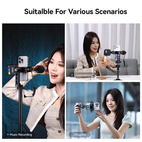 Gracias a varios puntos de fijación —incluida una placa de montaje, roscas de 1/4"-20, una rosca de 3/8"-16 y un orificio de posicionamiento ARRI—, el MA53 funciona como un compacto centro de rig móvil para micrófonos, luces LED, monitores o receptores inalámbricos. Tanto si grabas vlogs, creas contenido para redes sociales o retransmites en directo, el MA53 es una solución potente y versátil para montar tu smartphone.
