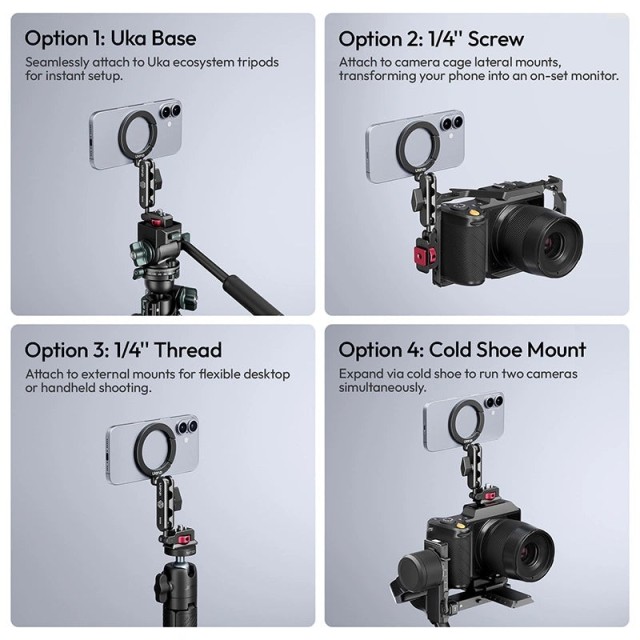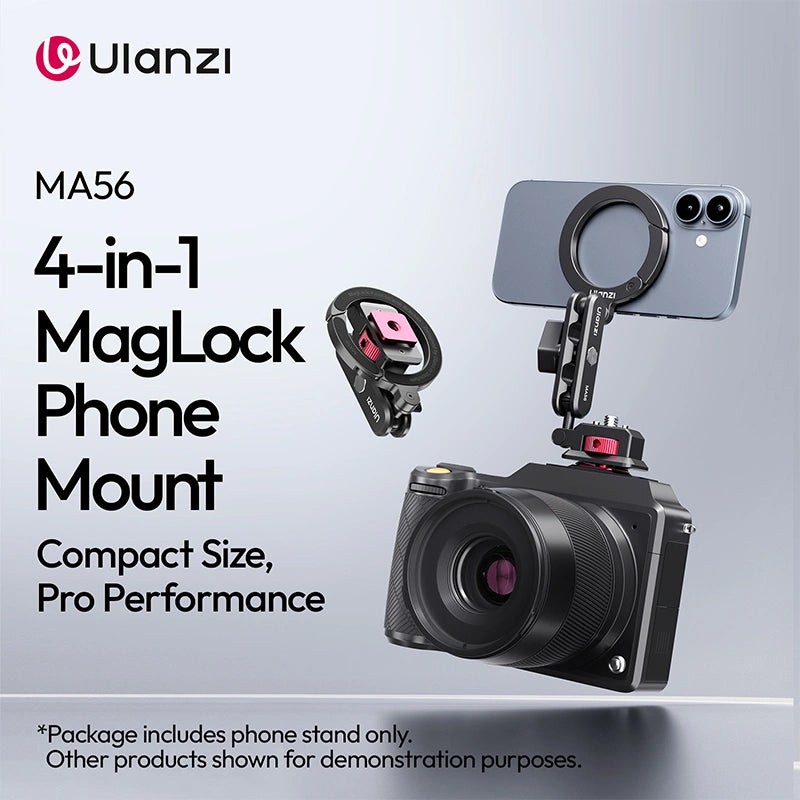 El soporte para móvil Ulanzi MA56 4 en 1 es una solución universal para los creadores de contenido móvil que buscan una estabilidad profesional. Este accesorio multifuncional sirve tanto como soporte seguro para el móvil como montura para trípode, lo que lo hace ideal para vlogs, retransmisiones en directo y fotografía. Admite fácilmente tanto el modo vertical como el horizontal, lo que garantiza composiciones perfectas para cualquier plataforma. Gracias a su construcción resistente y su diseño compacto, es fácil de llevar a cualquier aventura. Mejora tu equipo conectando micrófonos o luces directamente al soporte y crea contenido de alta calidad estés donde estés.