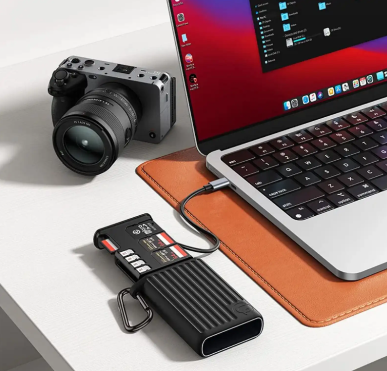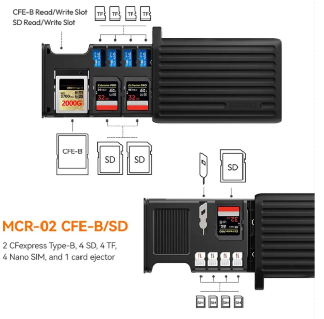 El MCR 02 también sirve como organizador para guardar tarjetas, con ranuras específicas para 2 tarjetas CFexpress tipo B, 4 tarjetas SD, 4 tarjetas Micro SD (TF) y 4 tarjetas Nano SIM, además de un práctico extractor de tarjetas y un adaptador. Alimentado a través de USB-C OTG, permite compartir archivos al instante con smartphones, tabletas y ordenadores. Su diseño compacto, fabricado en aleación de aluminio, ABS y silicona, garantiza resistencia y, al mismo tiempo, un peso reducido de 205 g.