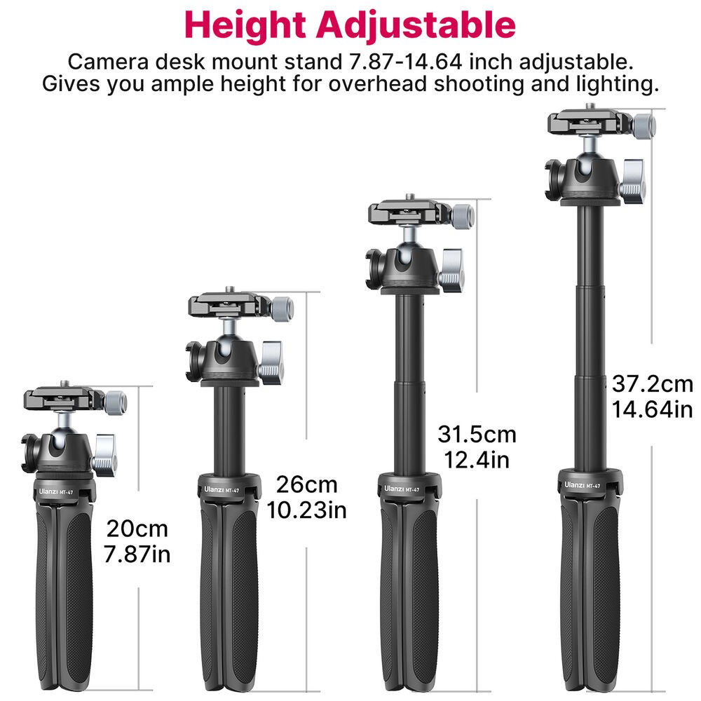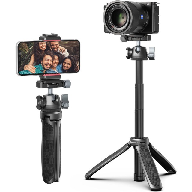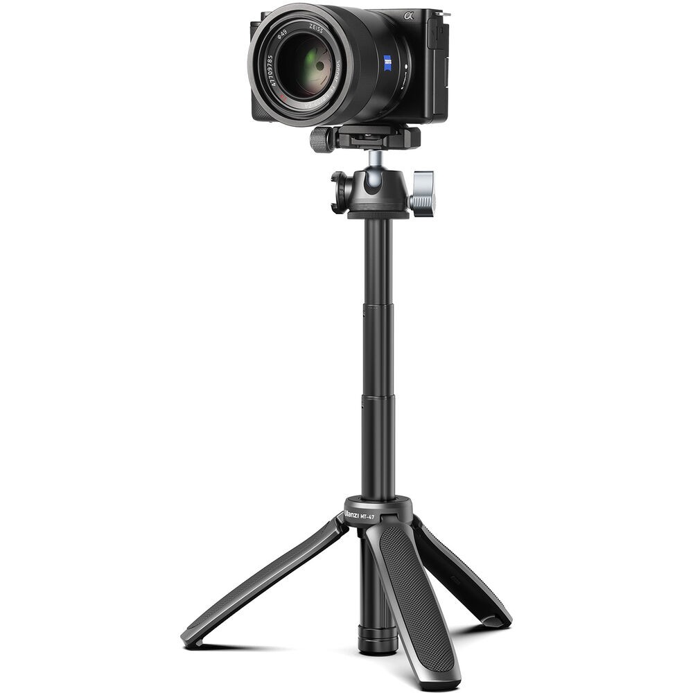 El mini trípode de mesa Ulanzi MT-47 es un soporte compacto, totalmente metálico, diseñado para creadores que necesitan un montaje rápido, portabilidad y la comodidad profesional de un sistema de liberación rápida. Gracias a su delgada rótula tipo Arca-Swiss con liberación rápida, su base giratoria y su diseño plegable, que también sirve como empuñadura para la cámara o palo selfie, es ideal para vlogs, streaming y fotografía de viajes.