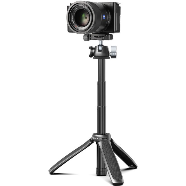 Las patas del trípode se despliegan y proporcionan un apoyo estable sobre la mesa gracias a las puntas de goma, que mejoran la adherencia y protegen las superficies. Cuando están plegadas, las patas forman un mango ergonómico con superficie antideslizante, lo que permite utilizar el MT-47 cómodamente como mango para vlogs o como palo selfie. Con una altura máxima de trabajo de 37,2 cm, es ideal para montajes de mesa, tomas desde ángulos bajos o fotografía a mano alzada.