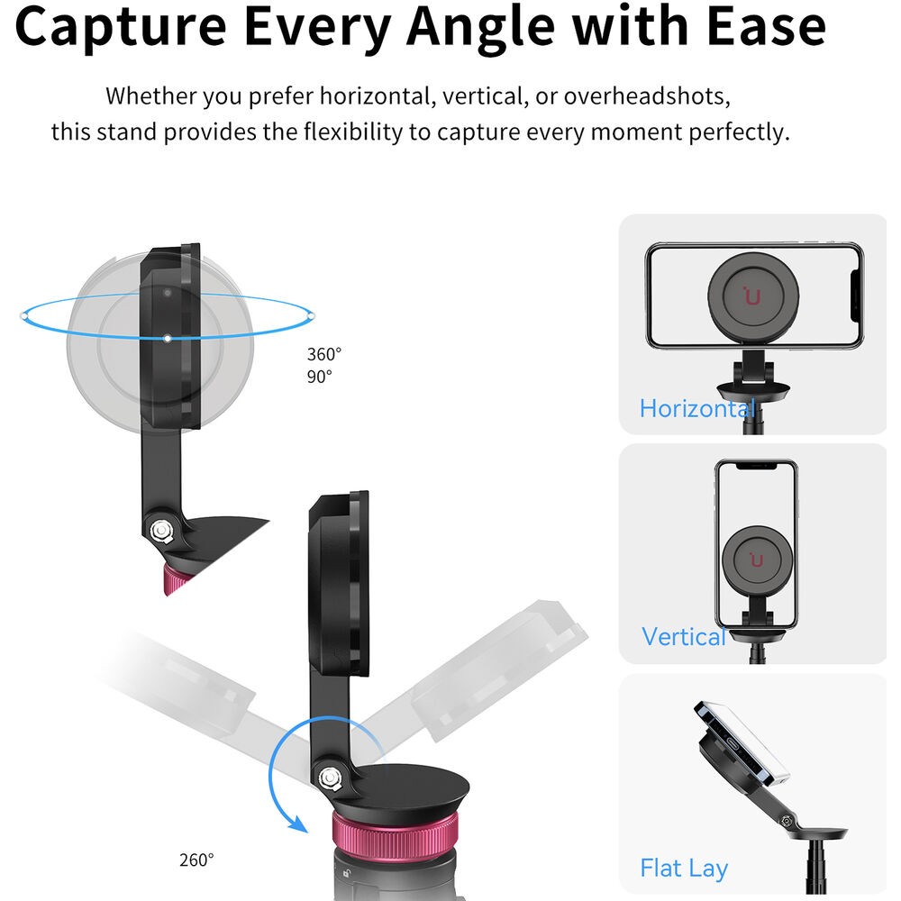 Captura imágenes perfectas en cualquier lugar con el minitrípode Ulanzi MT-84 para MagSafe. Este trípode convertible también funciona como palo selfie y cuenta con un soporte magnético compatible con teléfonos y fundas MagSafe. El soporte gira 360° y se inclina 90° para una orientación vertical u horizontal, lo que permite ángulos de disparo flexibles. Gracias a su robusta capacidad de carga de 1 kg, soporta teléfonos con accesorios adicionales, como micrófonos o luces LED. El MT-84 está fabricado en aluminio ligero y plástico resistente, y se puede extender hasta 60,2 pulgadas para capturas desde un ángulo elevado, mientras que su mando a distancia Bluetooth extraíble permite el control manos libres hasta una distancia de 32,8 pies. El MT-84 es ideal para vlogueros, creadores de contenido y viajeros, y facilita la captura de fotos y vídeos.