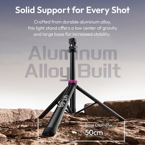 El Ulanzi MT-89 es un soporte de iluminación versátil y portátil diseñado para fotógrafos, camarógrafos y creadores de contenido. Gracias a su altura ajustable de hasta 208 cm, su soporte de fijación rápida y su estructura de aleación de aluminio, proporciona un soporte estable para cámaras, luces, soportes para teléfonos y cámaras de acción, lo que lo hace ideal tanto para uso en estudio como para uso móvil.