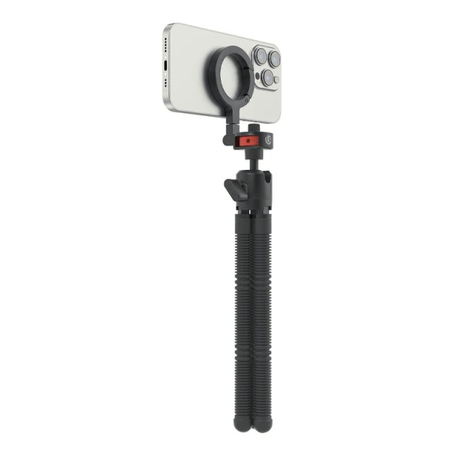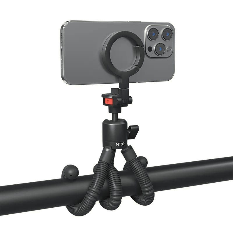 El trípode magnético flexible Ulanzi MT30 es un trípodeligero ideal para viajar, pensado para creadores de contenido que se desplazan con frecuencia. Su diseño único con mosquetón permite fijarlo fácilmente a mochilas, cinturones u otros accesorios, para que puedas llevarlo sin necesidad de usar las manos. El MT30 cuenta con una potente fuerza magnética en la parte delantera (>14 N), compatible con teléfonos MagSafe o con anillos magnéticos adhesivos, lo que permite una fijación segura sin necesidad de quitar la funda del teléfono. Los imanes de doble cara ofrecen flexibilidad para fijar accesorios. Las flexibles patas con triple articulación se pueden enrollar alrededor de objetos o ajustar en ángulos únicos, lo que resulta ideal para grabar sobre una mesa, tomar fotos en primera persona, realizar retransmisiones en directo y hacer fotos al aire libre. El soporte giratorio para el teléfono con rótula y ranura en U permite cambiar fácilmente entre la orientación vertical y horizontal. Con una capacidad de carga máxima de 1,3 kg, soporta de forma segura teléfonos, cámaras y cámaras de acción.