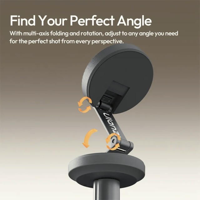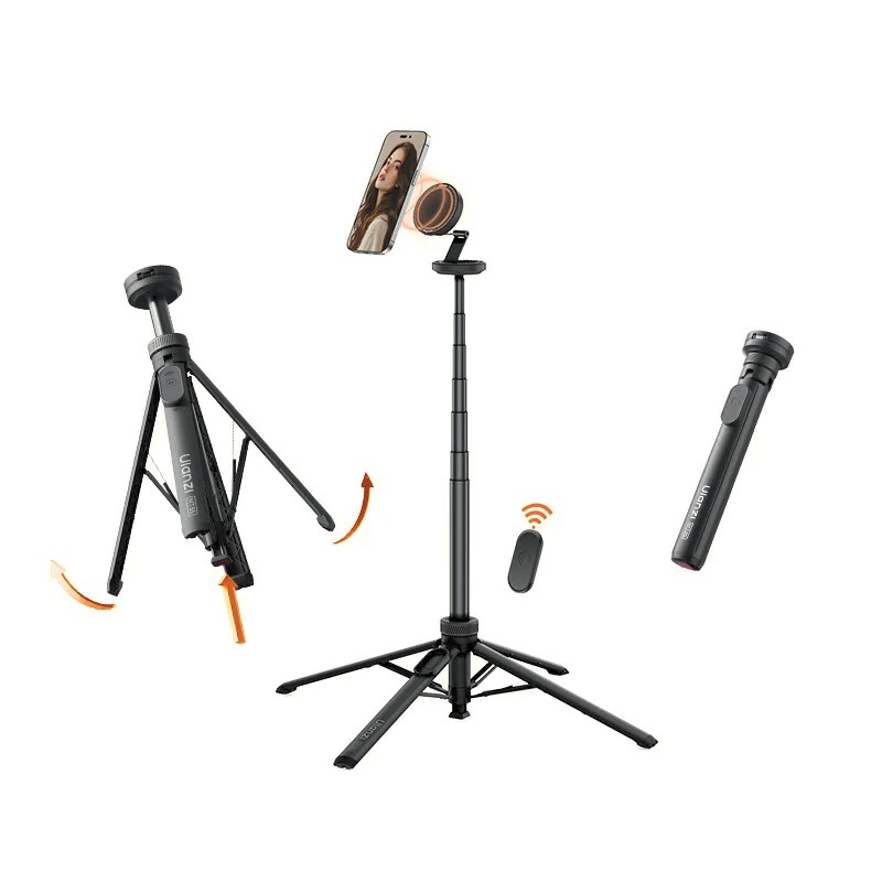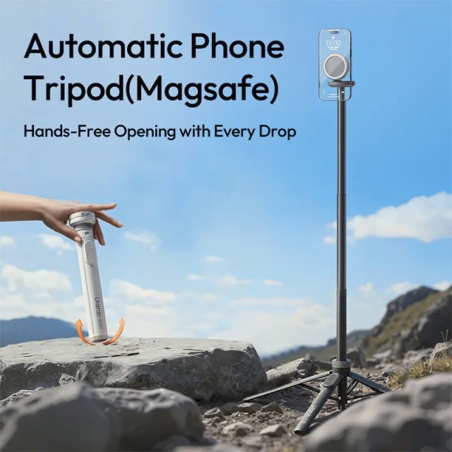 El Ulanzi MT85 es un trípode automático para teléfonos con un soporte magnético reversible compatible con MagSafe. Su estructura de cuatro patas garantiza la estabilidad, se puede extender hasta 1,5 m e incluye un mando a distancia por Bluetooth para hacer fotos sin necesidad de usar las manos. Es compacto y portátil, por lo que es ideal para selfies, fotos panorámicas, retransmisiones en directo y la creación de contenido.