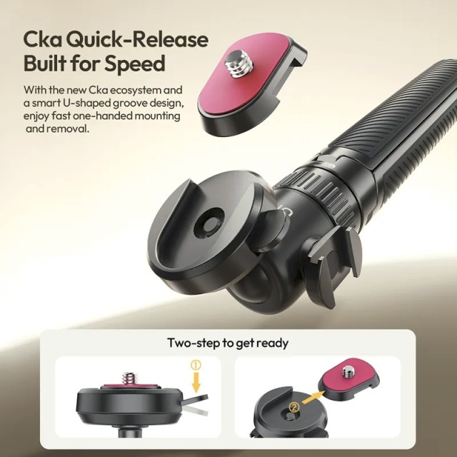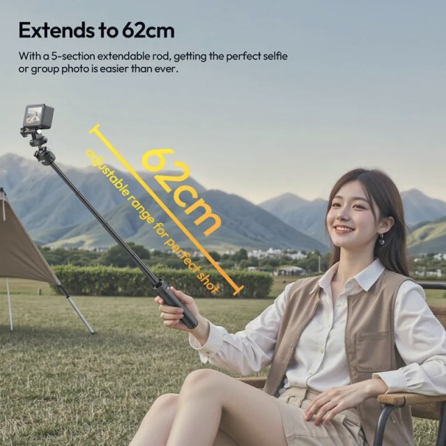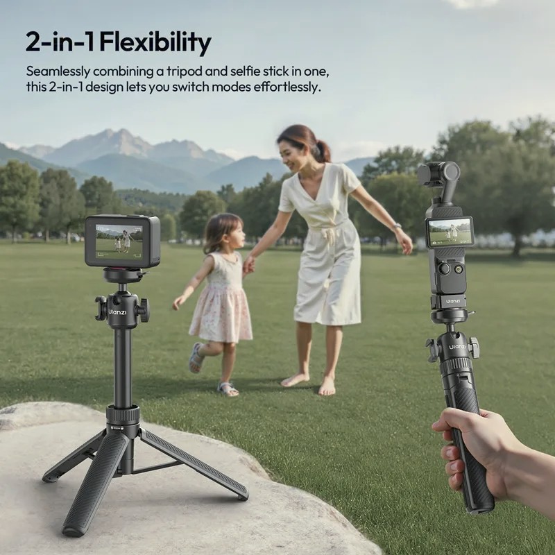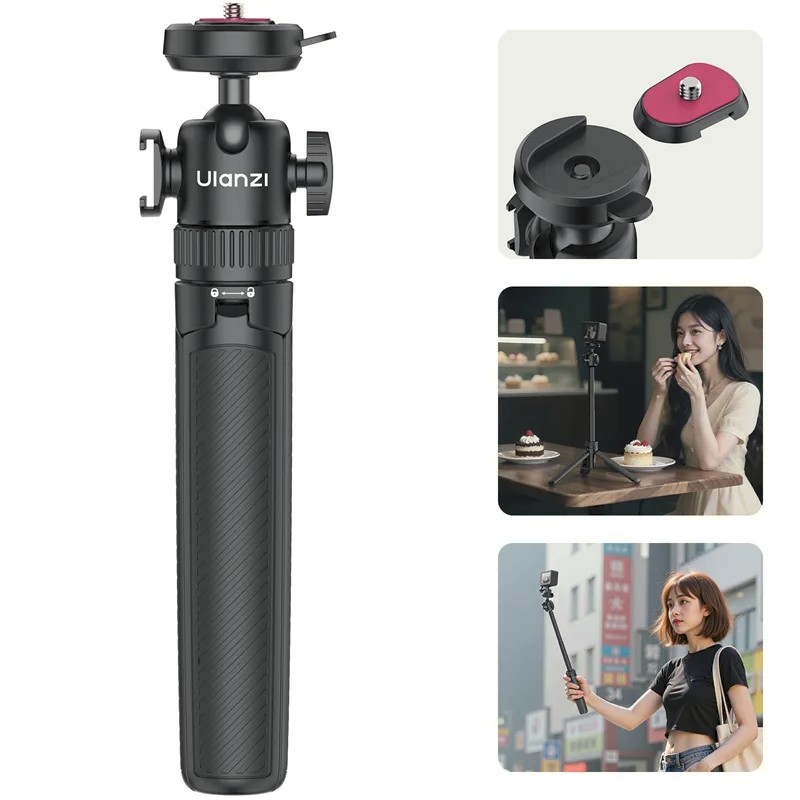 El Ulanzi MT90 es un compacto palo selfie y trípode 2 en 1 con sistema de fijación rápida Cka. Se puede extender hasta 62 cm, soporta dispositivos de hasta 1,5 kg y está equipado con una rótula giratoria de 360° para ángulos de grabación versátiles. Ideal para smartphones, cámaras de acción y cámaras sin espejo.