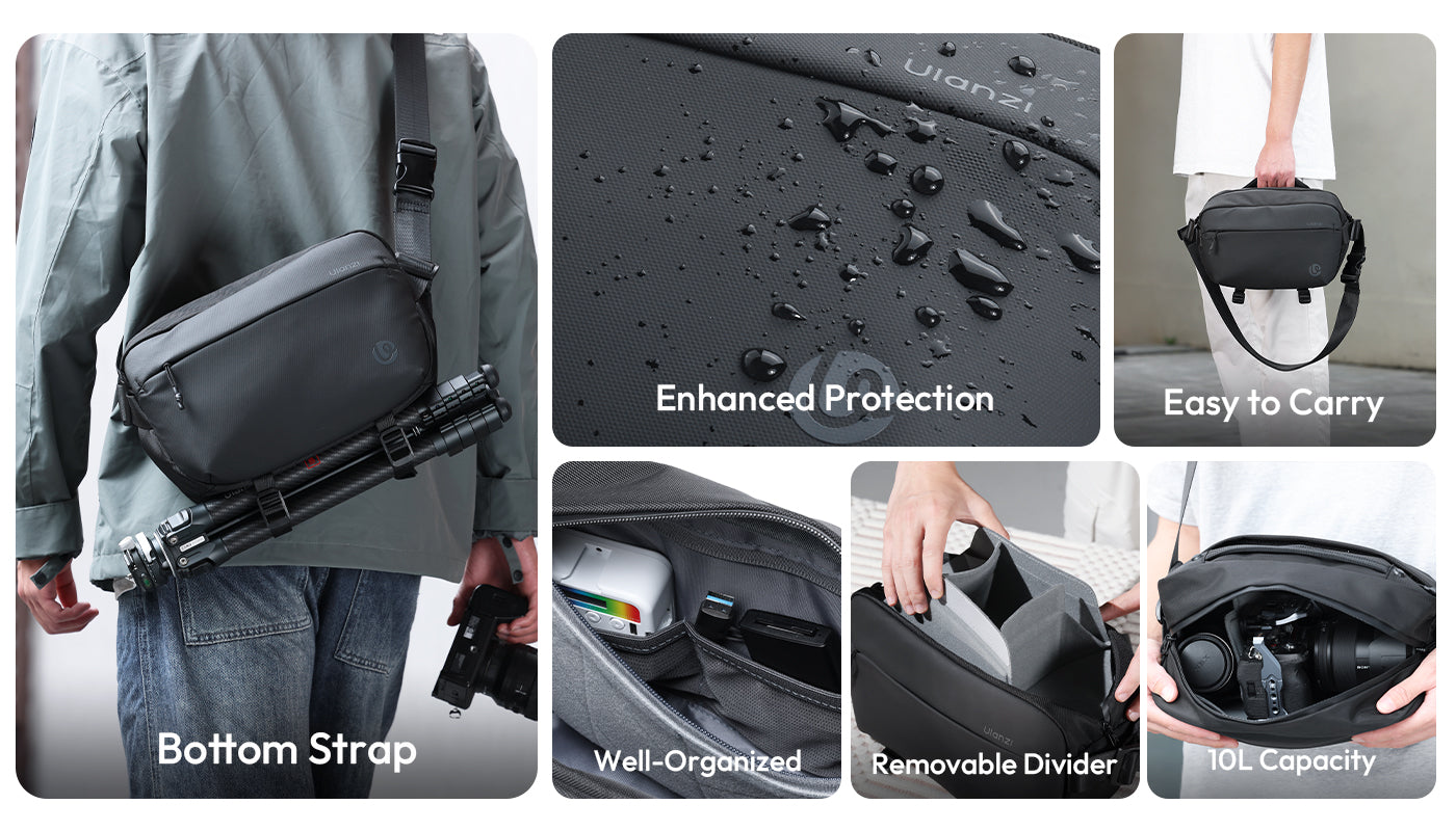 La bolsa para cámara Ulanzi B120 ofrece 10 litros de espacio de almacenamiento organizado para fotógrafos y viajeros. Está fabricada con tejido resistente al agua y cremalleras duraderas, por lo que protege tu equipo en cualquier condición meteorológica. Gracias a sus múltiples compartimentos, el estuche para tableta y la separadora extraíble, puedes alternar fácilmente entre la fotografía y el uso diario. Esta ligera bandolera con correa inferior ajustable para trípodes es ideal para fotografiar en la ciudad, hacer senderismo o escapadas de fin de semana.