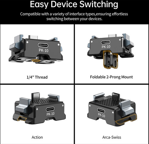Placa base Ulanzi PK-10 USB-C para DJI Osmo Pocket 3: soporte de 2 pines de aleación de aluminio con puerto de carga pasante, conmutador magnético rápido y un peso ultraligero de 34 g para grabar con fluidez mientras viajas.