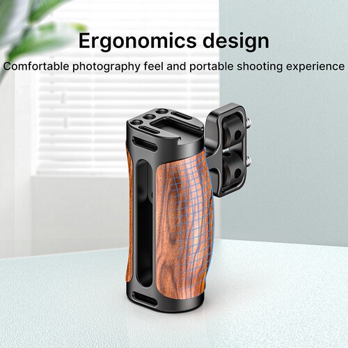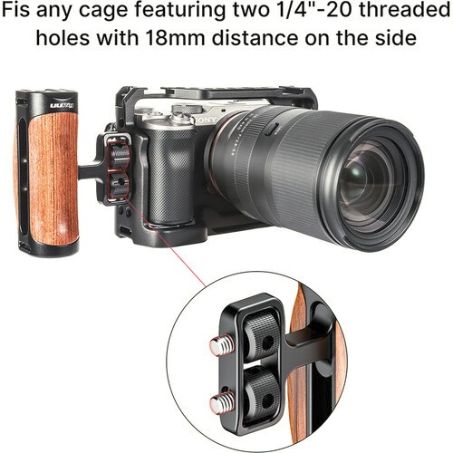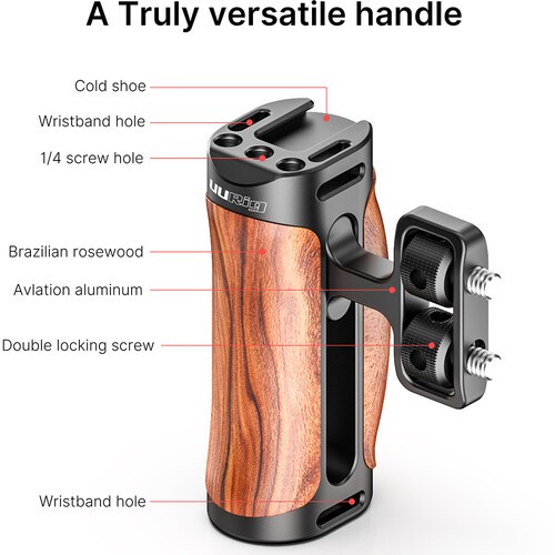 La empuñadura universal de madera Ulanzi R075 Left/Right combina madera de palisandro brasileño de primera calidad con aluminio aeronáutico y ofrece un agarre cómodo y seguro, con opciones de fijación universales para jaulas de cámara.
