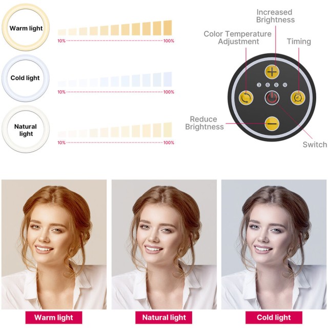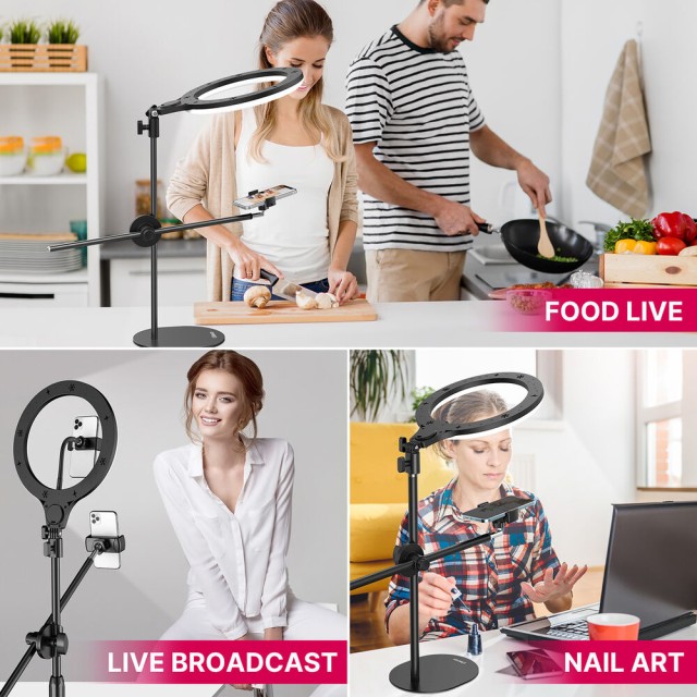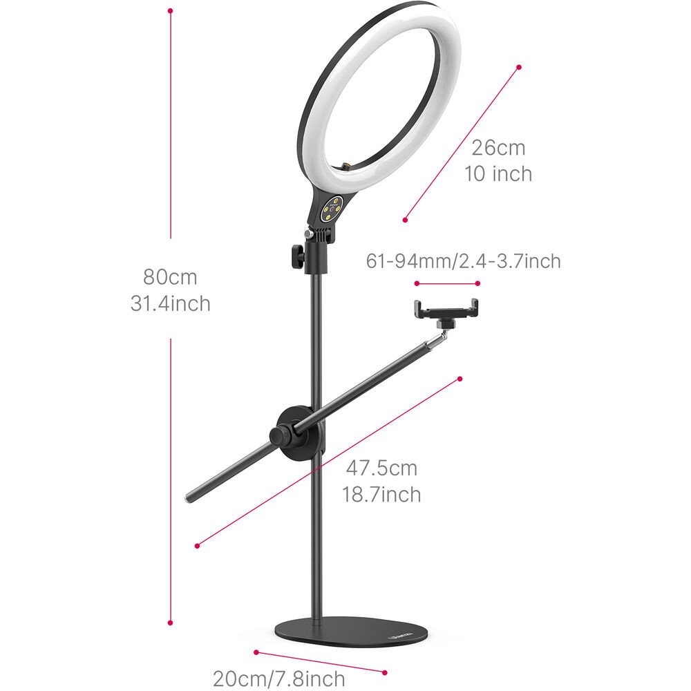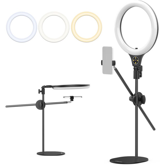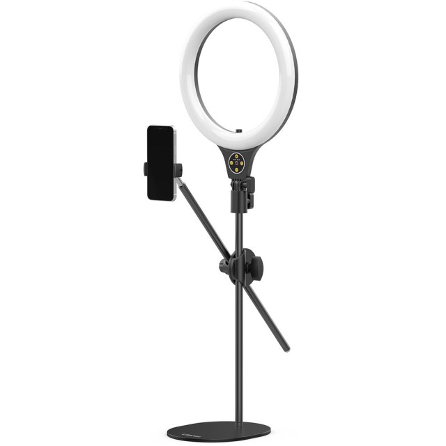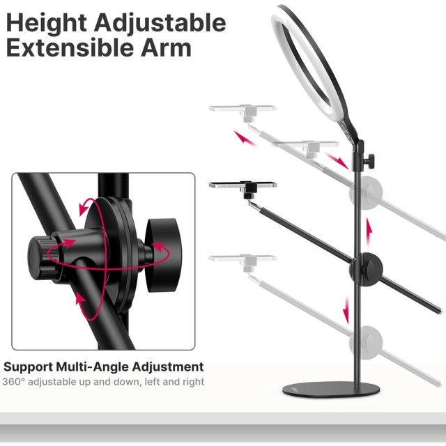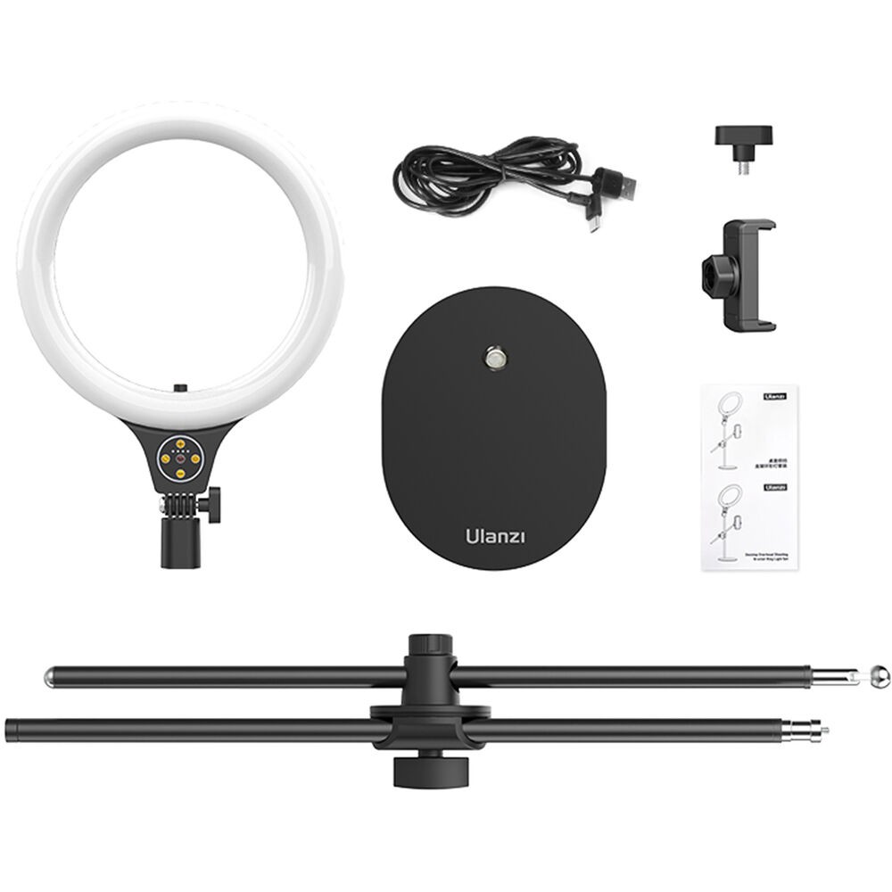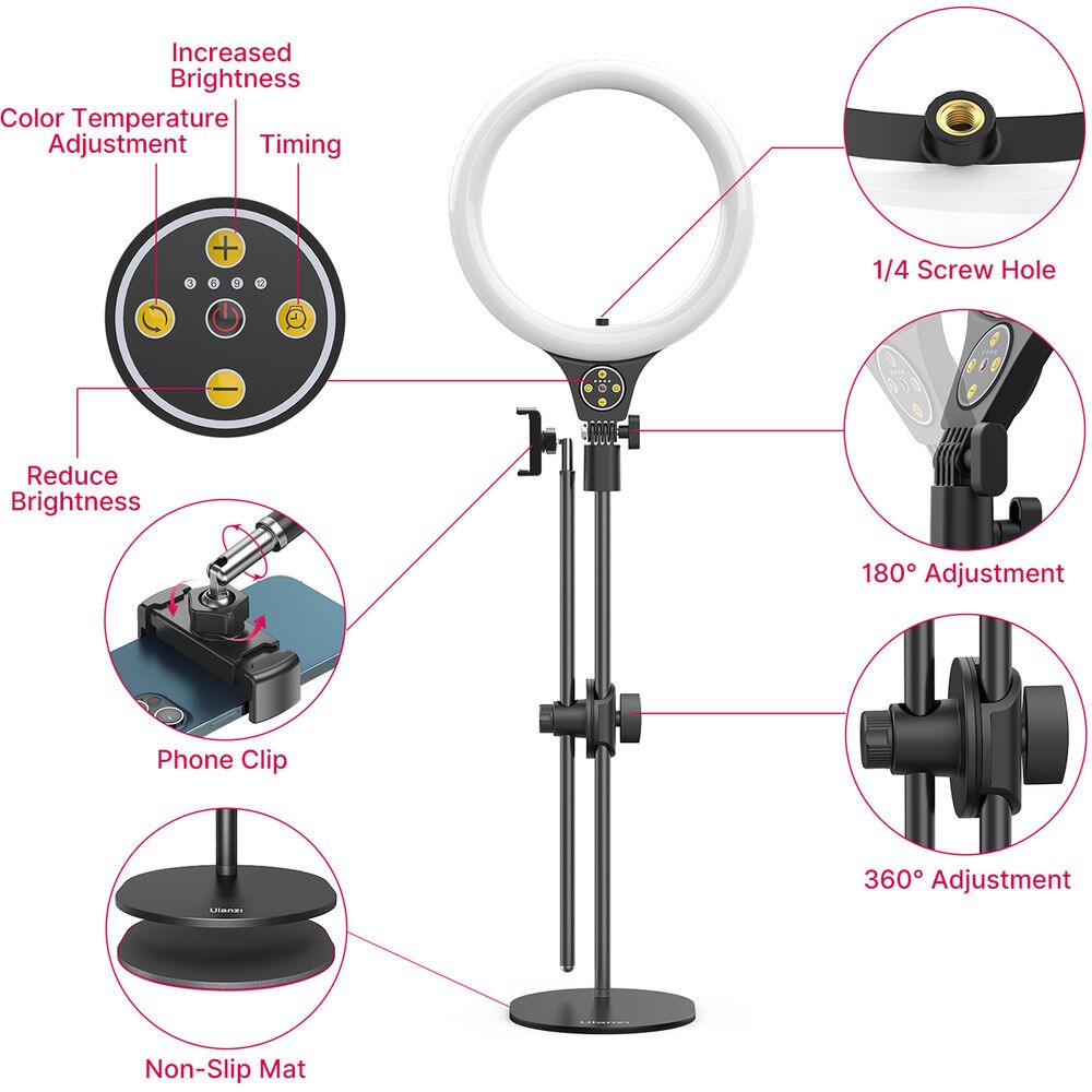 El kit de anillo de luz con soporte de montaje superior para escritorio Ulanzi T1 permite a los creadores iluminar y grabar objetos desde arriba con precisión y flexibilidad. Su luz circular LED de 10 pulgadas ofrece una temperatura de color ajustable de 3500 K (cálida) a 6500 K (luz diurna) y 11 niveles de brillo, lo que garantiza una iluminación óptima para diversos escenarios. El soporte se puede extender hasta 32 pulgadas y está equipado con dos varillas de soporte ajustables de forma independiente para la luz y el smartphone, cada una de las cuales se puede inclinar y girar 360° para una colocación precisa.