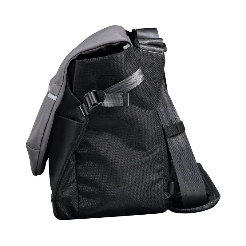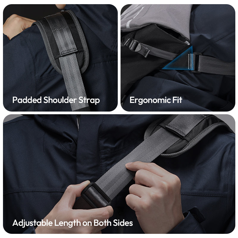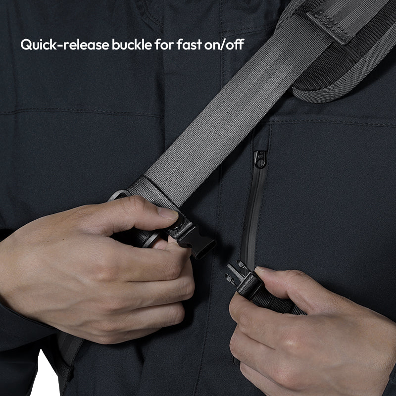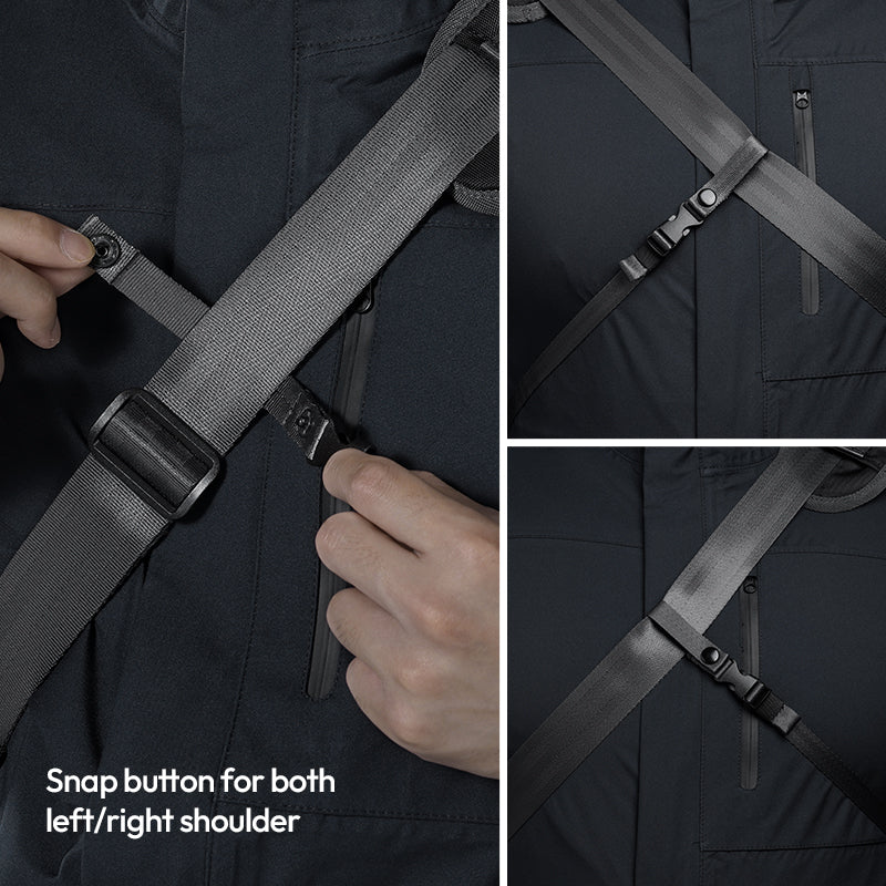 Gracias a la correa desmontable, que no requiere herramientas, puedes cambiar el lado de transporte en cuestión de segundos. La hebilla de cierre rápido permite quitársela al instante, mientras que los botones ajustables garantizan una colocación perfecta en el hombro izquierdo o derecho.