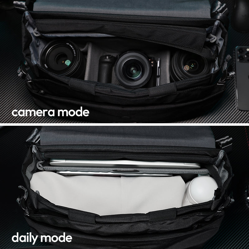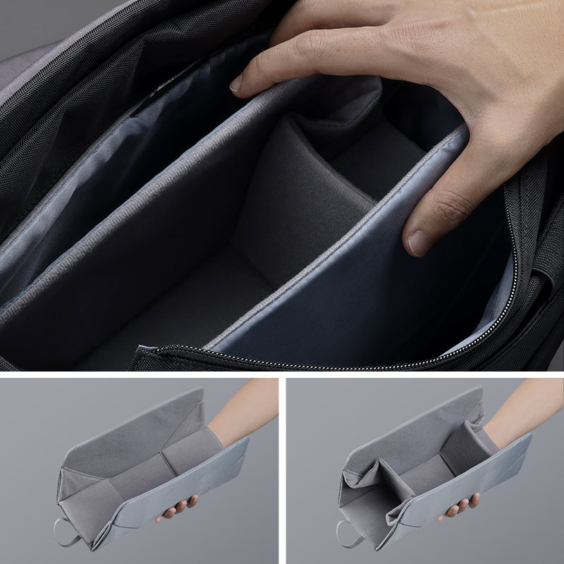 Cambia entre los modos de uso diario y para la cámara gracias a la divisoria interior modular, que se puede plegar o desmontar según sea necesario.