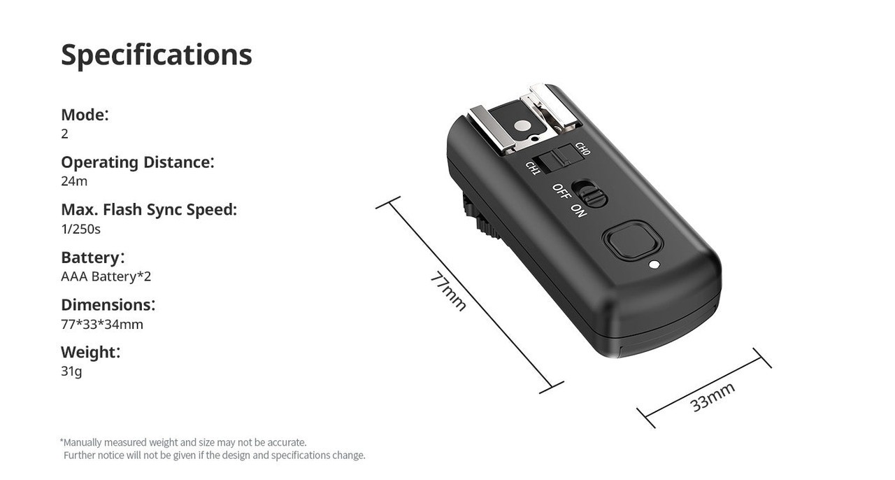 El TT-01 es ligero y cabe en el bolsillo, pesa solo 31 g, por lo que es ideal para fotografiar sobre la marcha, tanto si trabajas en estudio como sobre el terreno. Con una velocidad de sincronización máxima del flash de 1/250 s, ofrece un rendimiento fiable para retratos, acción e iluminación creativa.