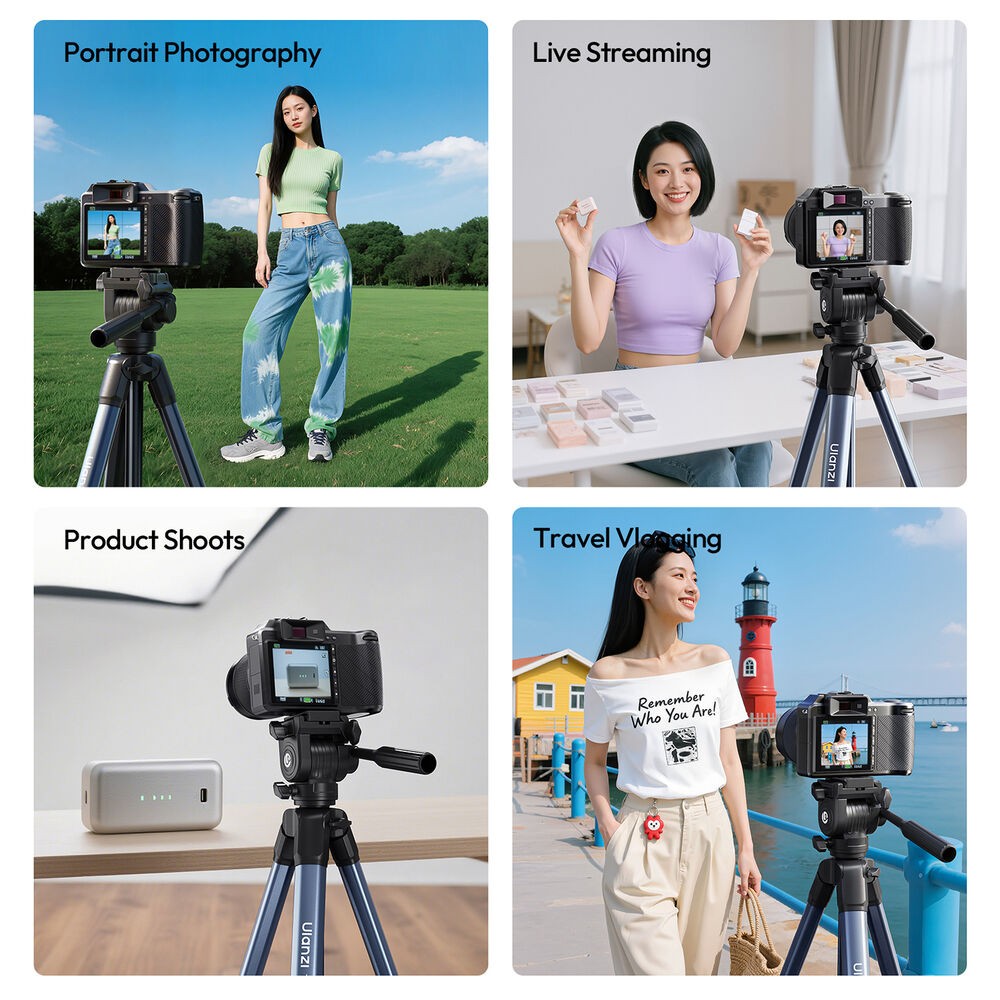 El trípode para vídeo Ulanzi TT39 es un trípode de aluminio ligero y versátil diseñado para creadores que viajan con frecuencia. Con una altura máxima de 155 cm, un cabezal de fijación rápida tipo Arca y una capacidad de carga de 3 kg, es ideal para cámaras, pequeños rigs y smartphones. Gracias a sus patas de cinco secciones, su cabezal giratorio e inclinable y los accesorios incluidos, es perfecto para grabar desde ángulos bajos y altos, mientras que su diseño compacto y plegable y su bolsa de transporte garantizan un fácil traslado.