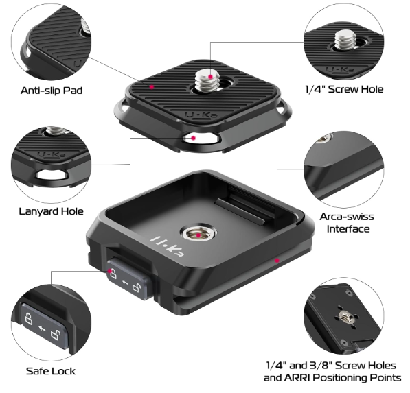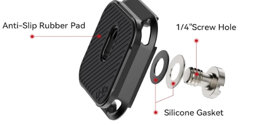 La placa de fijación rápida Ulanzi UKA02 es un adaptador de aluminio ultraligero, con un peso de 16 g, que permite cambiar al instante entre trípodes, estabilizadores, gimbals y jaulas mediante un tornillo estándar de 1/4"-20, compatible con la mayoría de cámaras fotográficas y de vídeo. Su diseño compacto, con unas dimensiones de 8,3 × 2,8 × 8,1 cm, incluye cuatro orificios para una correa en las esquinas que facilitan su transporte, lo que lo convierte en la solución ideal para los creadores que cambian de configuración sobre la marcha.