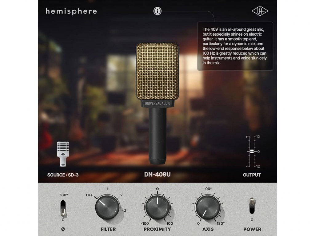 El micrófono puede utilizar el plugin de modelado Hemisphere*, que se puede descargar gratuitamente. De este modo, obtendrás el sonido de micrófonos legendarios, tanto icónicos como estándar, de fabricantes de todo el mundo. Para más detalles sobre Hemisphere, consulta más abajo.*