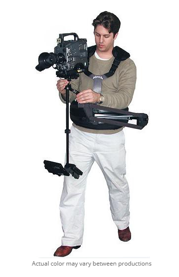 El paquete incluye un chaleco ergonómico con acolchado torácico moldeado, un sistema de 4 puntos de sujeción en el torso y una placa torácica de altura ajustable que soporta cómodamente equipos de cámara pesados durante largas sesiones de rodaje. El trípode estabilizador también integra un monitor en color de 5" (estándar NTSC; PAL o 7" opcional), que sirve tanto como visor externo como contrapeso para el equilibrio vertical. El monitor y la batería son totalmente ajustables para un ajuste fino del equilibrio y el funcionamiento.