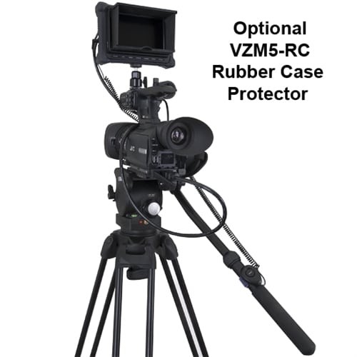 El monitor VZM5 admite señales de 1080p y 720p, 480i/p, 576i/p y es compatible con HDCP. Los ajustes configurables incluyen brillo, contraste, saturación, nitidez, temperaturas de color preestablecidas (D65/D93), marcas de área de seguridad, marcas de línea central y 4:3, modos de underscan/overscan, modo monocromático e inversión de imagen para montaje invertido. La monitorización del audio está disponible a través de una salida de auriculares de 3,5 mm, mientras que los dos soportes de ¼”-20 en la parte superior e inferior ofrecen opciones de montaje flexibles.