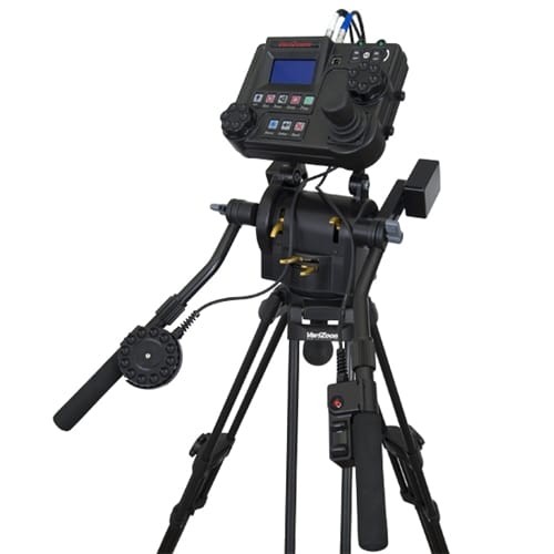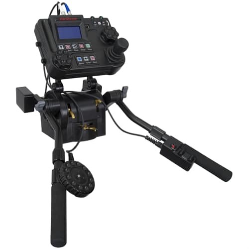 El sistema incluye una consola de control, barras de control codificadas, un cable de control de 15 m, un cable de alimentación de 9 m, una fuente de alimentación y una maleta rígida con ruedas. Las barras de control ofrecen una velocidad escalable, un control fluido del objetivo y un funcionamiento ergonómico, lo que las hace ideales para configuraciones con un solo operador. La consola avanzada está equipada con un joystick de 3 ejes para giro/inclinación/zoom, botones de gran tamaño para el enfoque y el menú, un teclado retroiluminado y parámetros de movimiento personalizables.