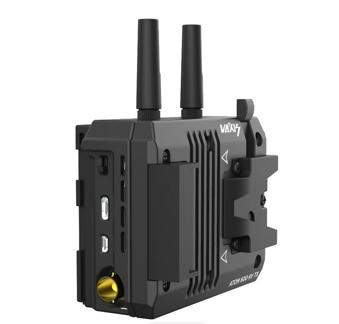 El transmisor inalámbrico Vaxis ATOM 600 KV se monta directamente en la RED KOMODO y transmite vídeo con una resolución de 1080p60 hasta una distancia de 600 pies en línea recta, con una latencia inferior a 80 ms a través de SDI/HDMI; se alimenta mediante una batería V-mount con conexión a la cámara y cuenta con multidifusión Wi-Fi a dispositivos iOS.