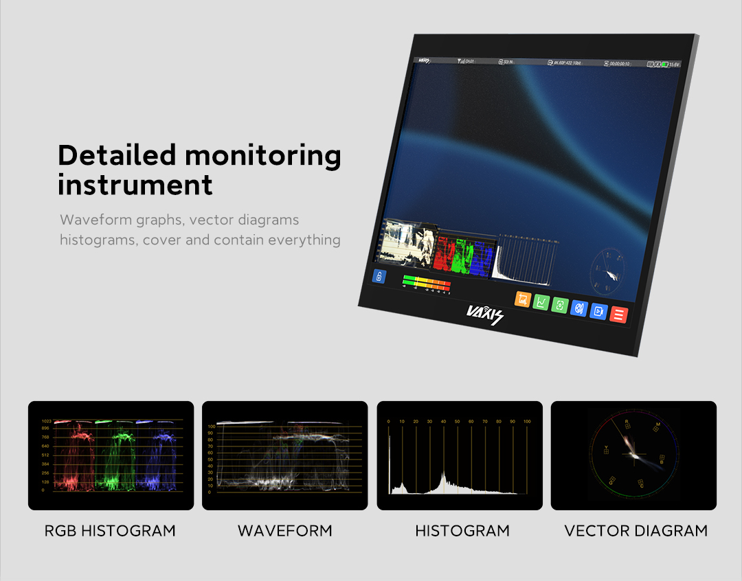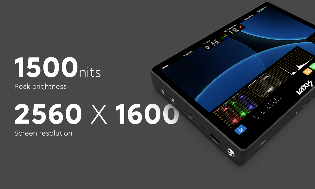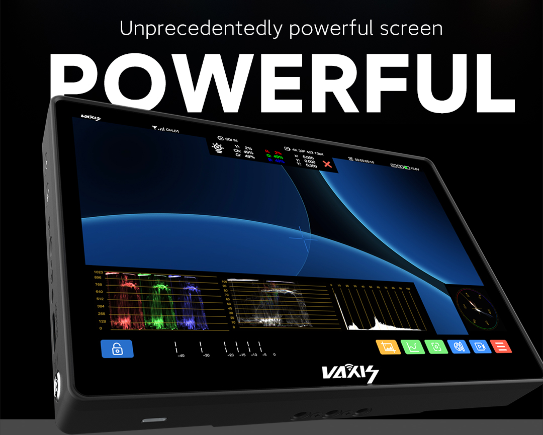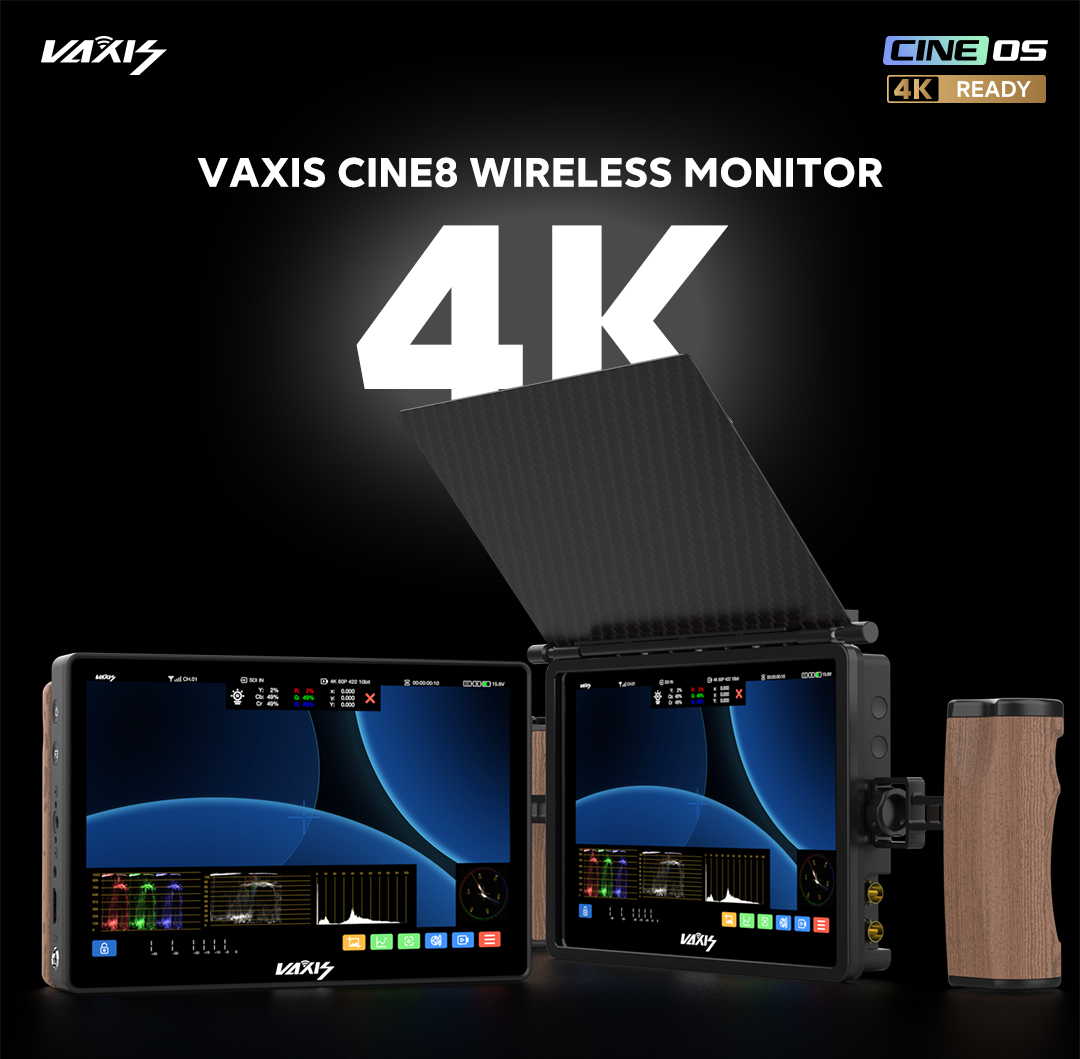 Monitor Vaxis Storm Cine 8: 8,9 pulgadas, resolución 4K de 2560 × 1600 píxeles, brillo máximo de 1500 nits, con dispositivo Storm 3000 RX integrado. Sistema operativo propio: el primer y único sistema operativo propio de Vaxis, CINE OS, para pantallas táctiles. Interpolación tetraédrica 3D-LUT. Ajuste preciso de colores en el espacio tridimensional, LUT más eficaz y precisa. Modo imagen en imagen. Acceso multicanal a la pantalla, cambio de la posición de la imagen en la imagen a cualquier lugar. Comparación de pantallas y LUT. Congelación de imagen no convencional: la captura de pantalla actual y la imagen en tiempo real se pueden comparar directamente en el sistema. Amplias opciones de control inalámbrico