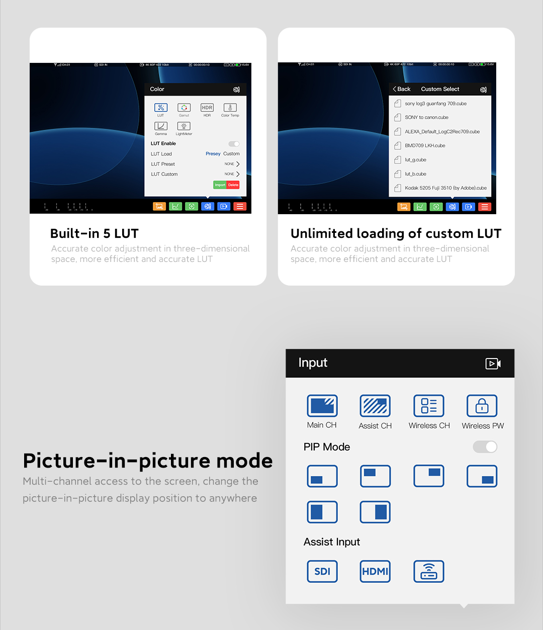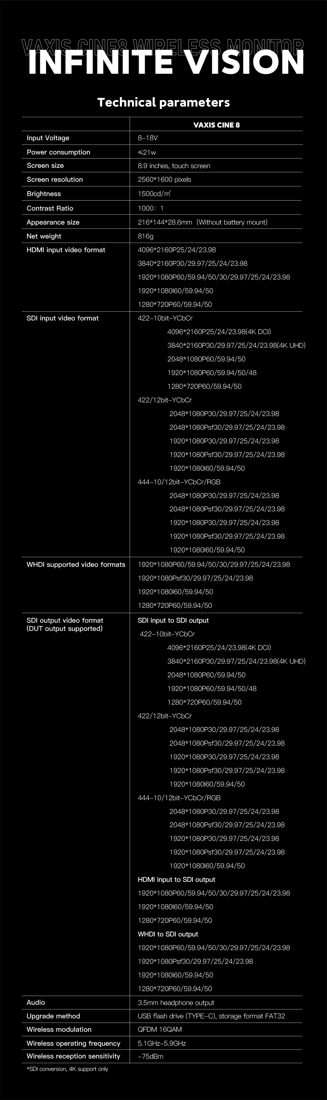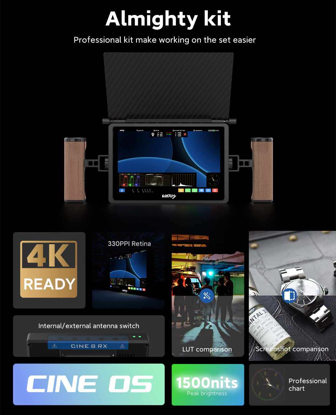 Monitor Vaxis Storm Cine 8: 8,9 pulgadas, resolución 4K de 2560 × 1600 píxeles, brillo máximo de 1500 nits, con dispositivo Storm 3000 RX integrado. Sistema operativo propio: el primer y único sistema operativo propio de Vaxis, CINE OS, para pantallas táctiles. Interpolación tetraédrica 3D-LUT. Ajuste preciso de colores en el espacio tridimensional, LUT más eficaz y precisa. Modo imagen en imagen. Acceso multicanal a la pantalla, cambio de la posición de la imagen en la imagen a cualquier lugar. Comparación de pantallas y LUT. Congelación de imagen no convencional: la captura de pantalla actual y la imagen en tiempo real se pueden comparar directamente en el sistema. Amplias opciones de control inalámbrico
