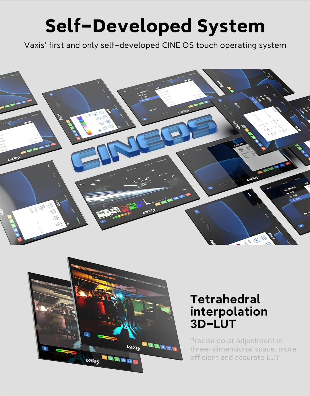 Monitor Vaxis Storm Cine 8: 8,9 pulgadas, resolución 4K de 2560 × 1600 píxeles, brillo máximo de 1500 nits, con dispositivo Storm 3000 RX integrado. Sistema operativo propio: el primer y único sistema operativo propio de Vaxis, CINE OS, para pantallas táctiles. Interpolación tetraédrica 3D-LUT. Ajuste preciso de colores en el espacio tridimensional, LUT más…