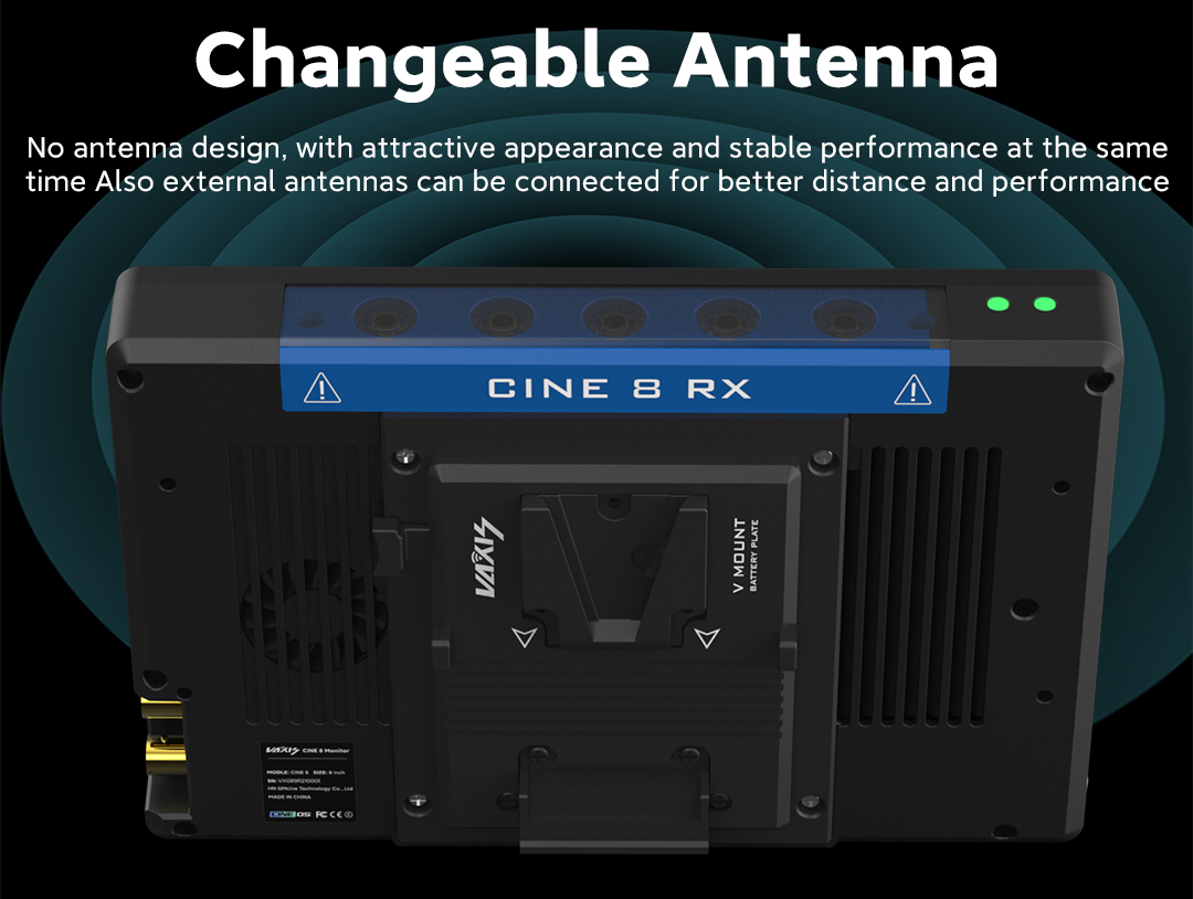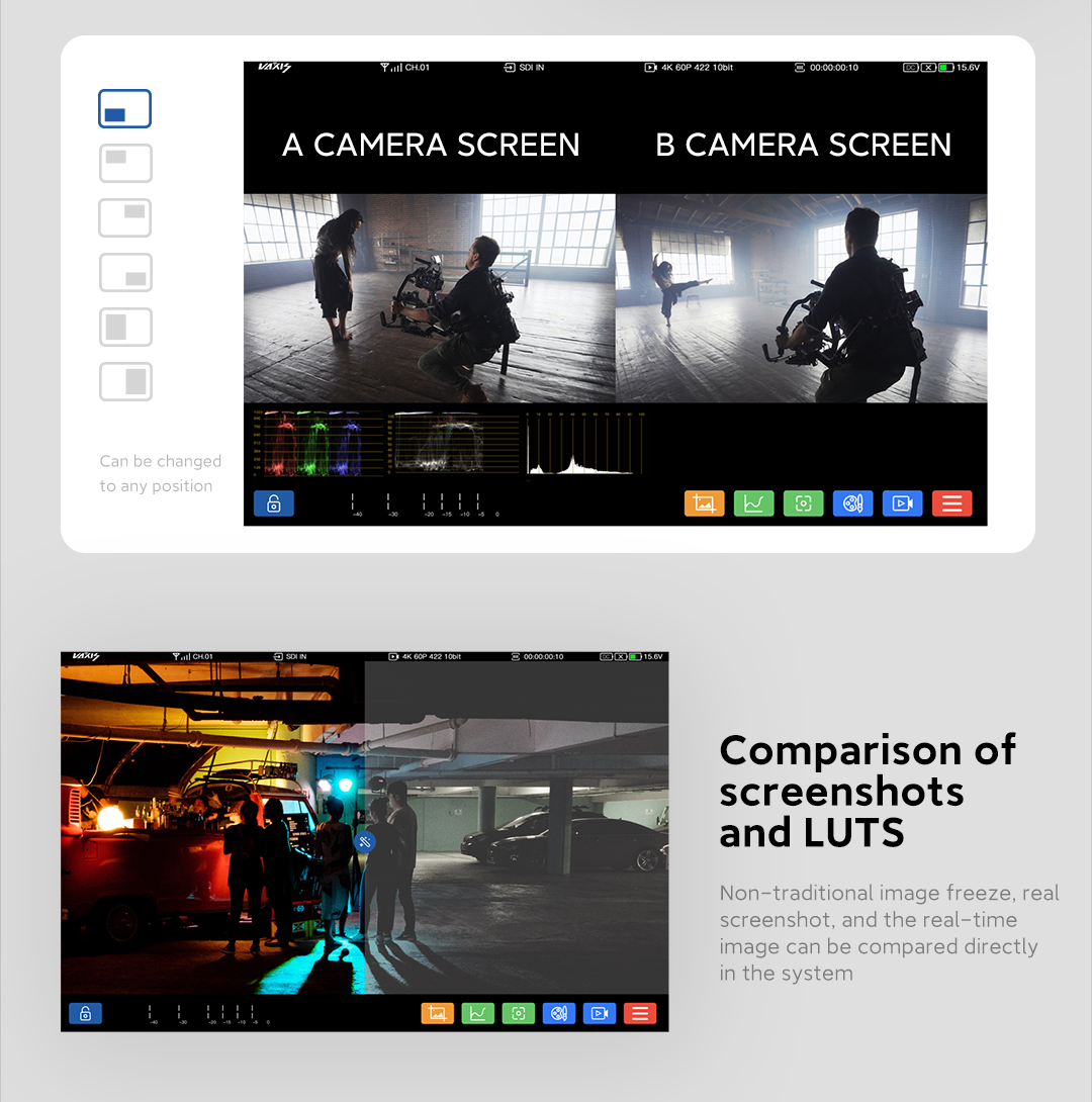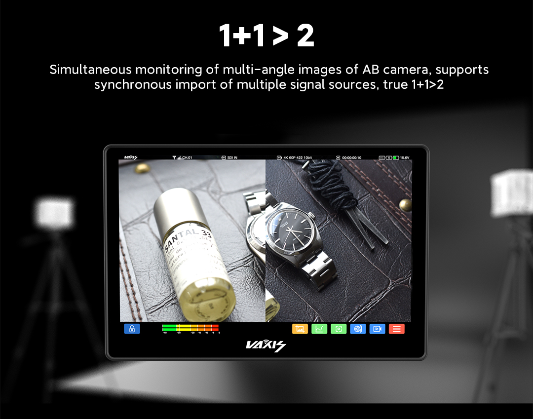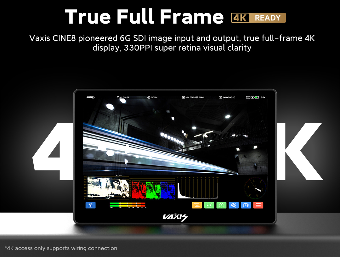 Cuenta con todas las funciones de un sistema de vídeo inalámbrico tradicional y un modo de interacción optimizado. Ofrece diversas opciones de selección de antena e integra la función de rango de frecuencias. Herramienta de monitorización detallada. Gráficos de formas de onda, diagramas vectoriales, histogramas, envolventes... lo incluye todo. Verdadero Full Frame 4K READY. Vaxis CINE8 es pionero en el campo de la entrada y salida de imagen 6G SDI, con una pantalla 4K full frame real y una nitidez visual Super Retina de 303 PPI. 1+1 > 2. Visualización simultánea de la imagen desde múltiples ángulos de la cámara AB
