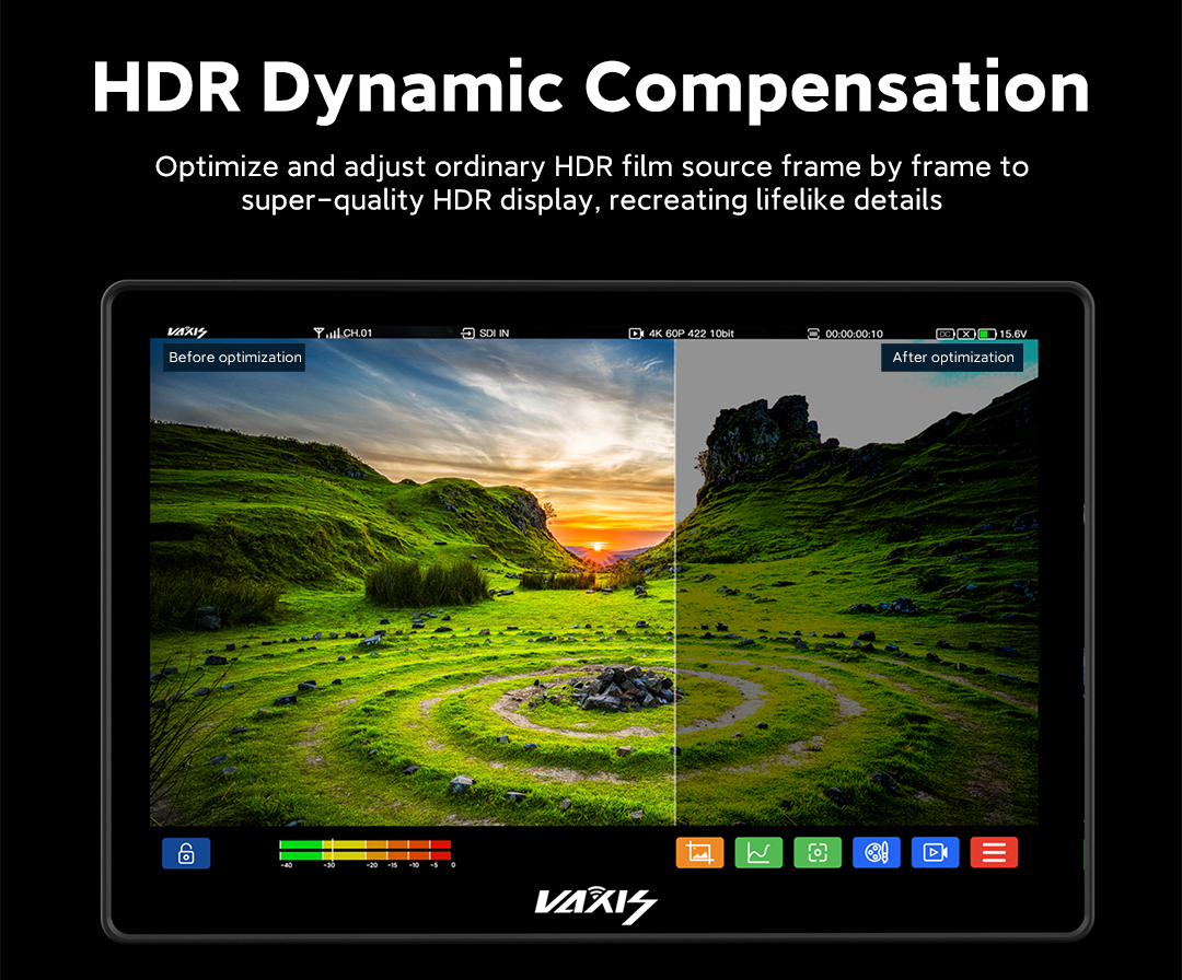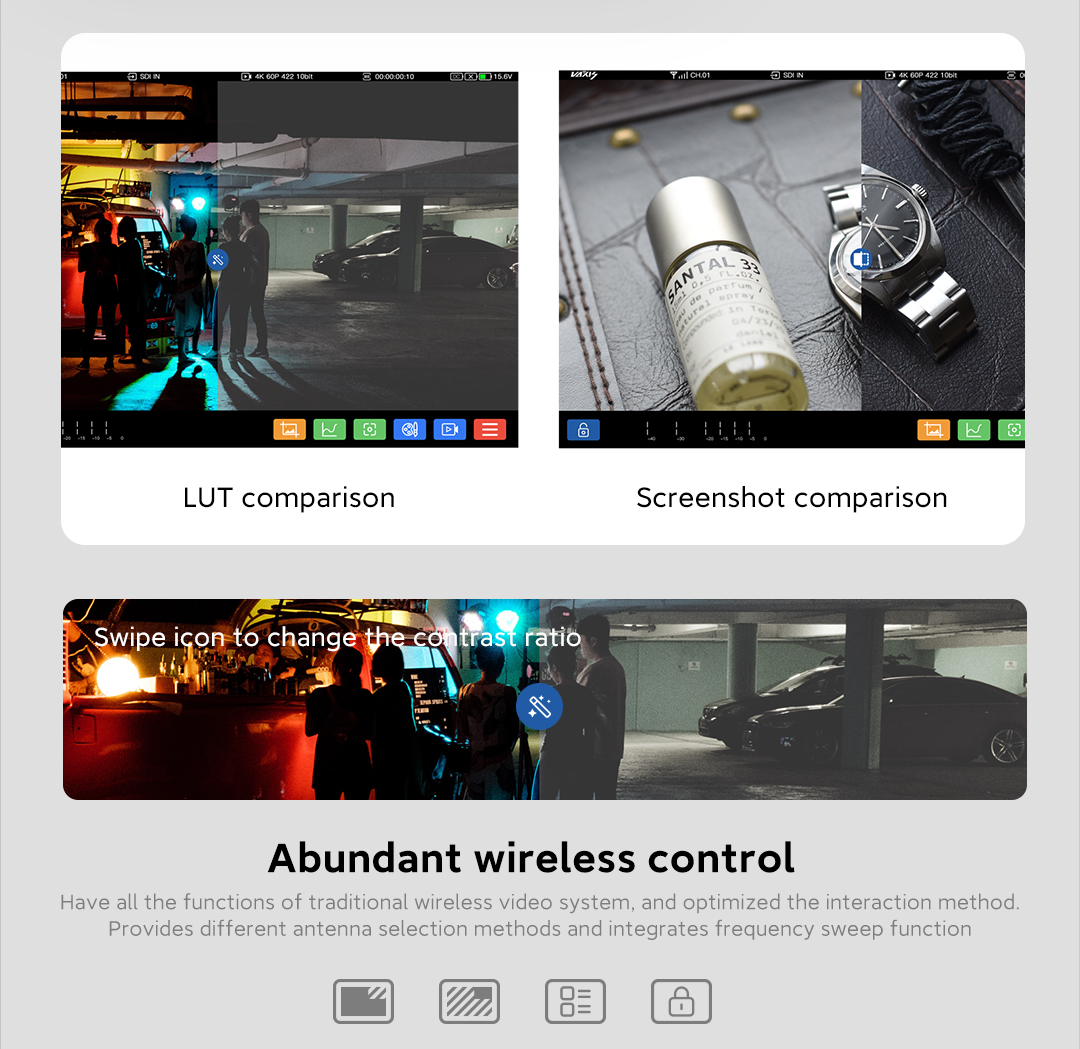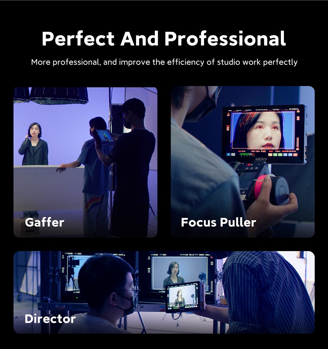 Cuenta con todas las funciones de un sistema de vídeo inalámbrico tradicional y un modo de interacción optimizado. Ofrece diversas opciones de selección de antena e integra la función de rango de frecuencias. Herramienta de monitorización detallada. Gráficos de formas de onda, diagramas vectoriales, histogramas, envolventes... lo incluye todo. Verdadero Full Frame 4K READY. Vaxis CINE8 es pionero en el campo de la entrada y salida de imagen 6G SDI, con una pantalla 4K full frame real y una nitidez visual Super Retina de 303 PPI. 1+1 > 2. Visualización simultánea de la imagen desde múltiples ángulos de la cámara AB