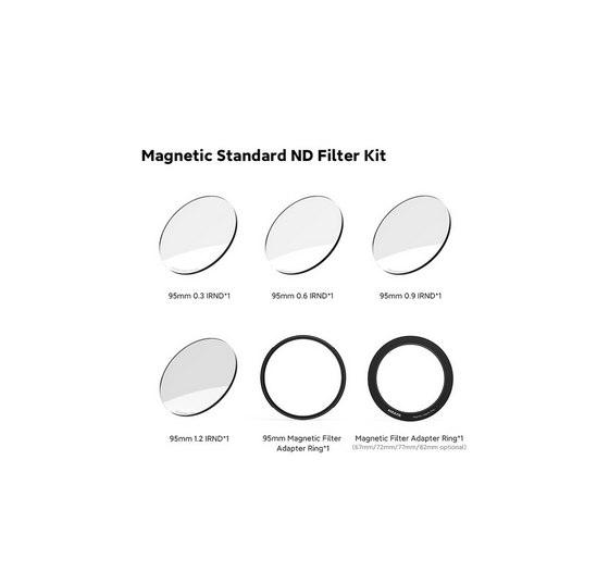 El juego de filtros ND magnéticos estándar Vaxis VFX de 95 mm incluye filtros IRND de 1, 2, 3 y 4 pasos con un anillo adaptador magnético que permite un cambio rápido y el apilamiento de los filtros para un control preciso de la exposición y una reproducción fiel de los colores. Es compatible con objetivos de 95 mm o con la caja mate Tilt Mirage y utiliza cristal óptico K95 de primera calidad con filtro de espectro completo IR/UV y un tratamiento superficial de 12 capas en ambos lados.