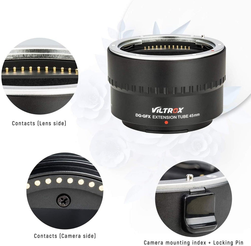 El tubo extensor Viltrox DG-GFX de 45 mm ha sido desarrollado específicamente para las cámaras de formato medio Fuji GFX FUJIFILM GFX50S/GFX50R.Se puede utilizar de forma independiente o en combinación con otro tubo extensor de 18 mm, lo que permite obtener 3 tipos diferentes de aumento y funciona a la perfección con el enfoque automático de la cámara. Eje limpio, ajuste perfecto. Interfaz metálica, enfoque automático, mejor transmisión.