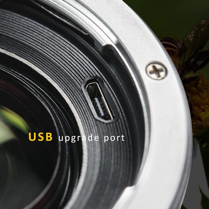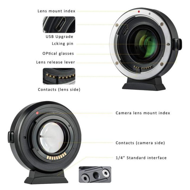 Además de adaptar mecánicamente los objetivos Canon EF a la montura EF-M (sistema M), también reduce la distancia focal (x 0,71) y aumenta la luminosidad en aproximadamente 1 paso de diafragma. Los contactos eléctricos transmiten las señales para el autofoco y el diafragma, así como los metadatos EXIF; el puerto USB sirve para actualizar el firmware. La parte inferior del adaptador cuenta con una rosca de 1/4" para accesorios de montaje o trípode.
