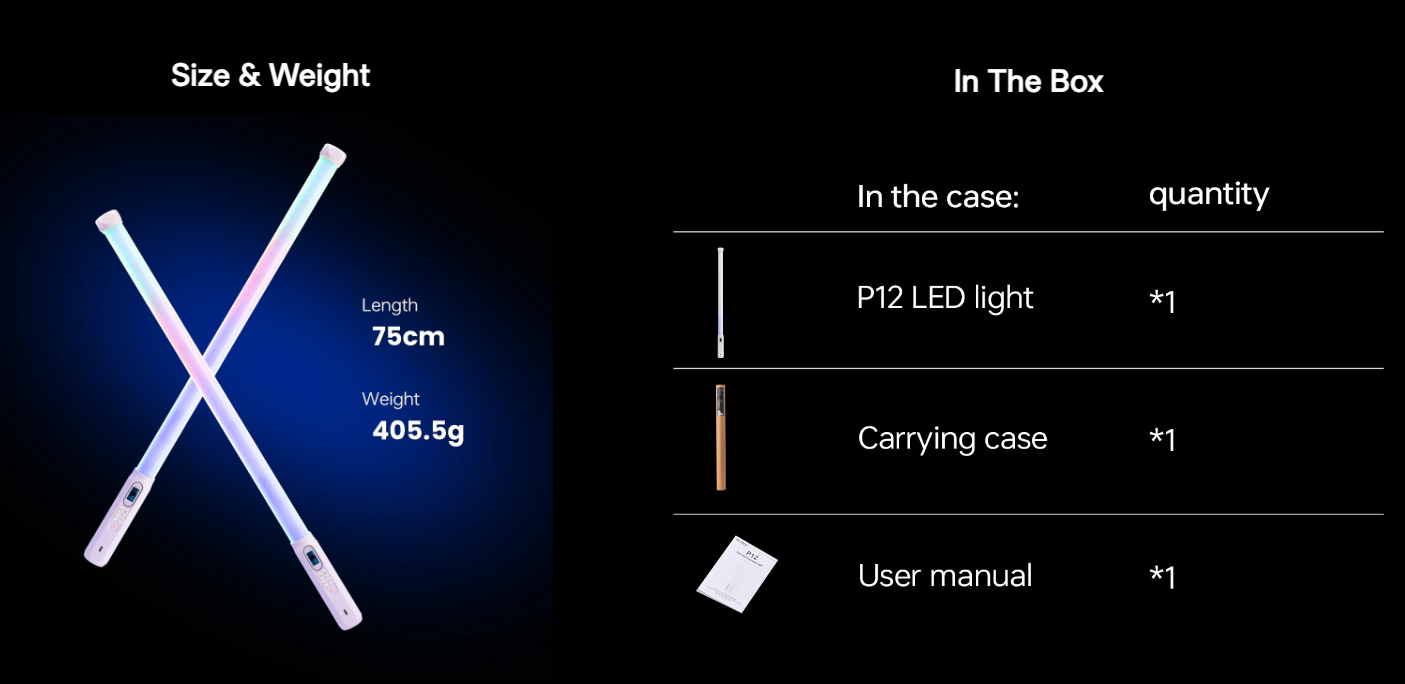 Equipado con 144 LED de alta calidad y un índice CRI de RA≥95, el P12 garantiza una iluminación brillante y uniforme con una reproducción precisa del color. Su capacidad RGB completa ofrece acceso a 36 000 colores, con un control preciso sobre el tono, la saturación y el brillo, mientras que el rango de temperatura de color ajustable de 2500 K a 8500 K facilita la adaptación a cualquier entorno de iluminación.