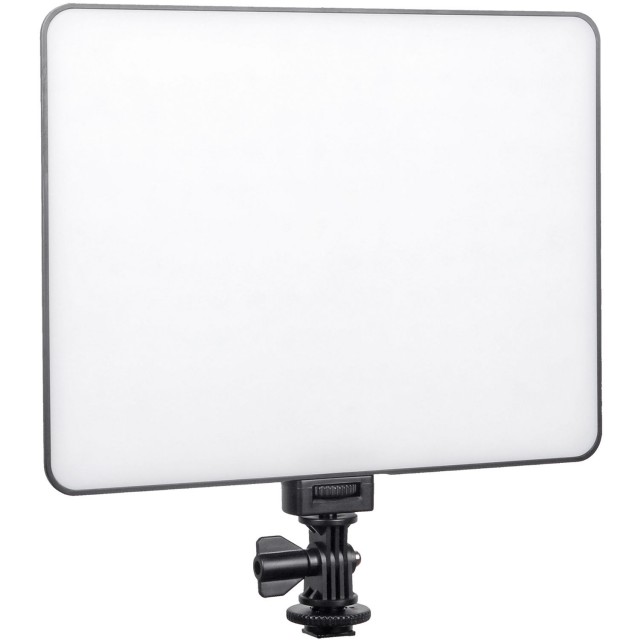 Luz LED bicolor de 30 W fácilmente transportable, con temperatura de color ajustable (en un rango de 3300-5600 K) e intensidad regulable (20-100 %; máx. 2500 lm, 2450 lx/0,5 m). Ofrece la posibilidad de control remoto inalámbrico (2,4 GHz, mando incluido) y la opción de alimentación mediante baterías recargables (NP-F550 / F570 / F960 / F970, batería no incluida) o fuente de alimentación externa (incluida en el paquete). La configuración de los parámetros se facilita gracias a una pantalla LCD de fácil lectura. Dimensiones: 260 x 200 x 22 mm; peso: 556 g.