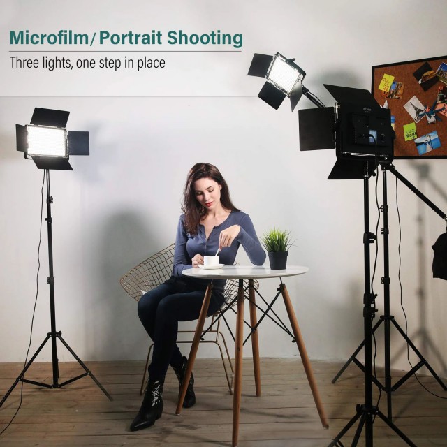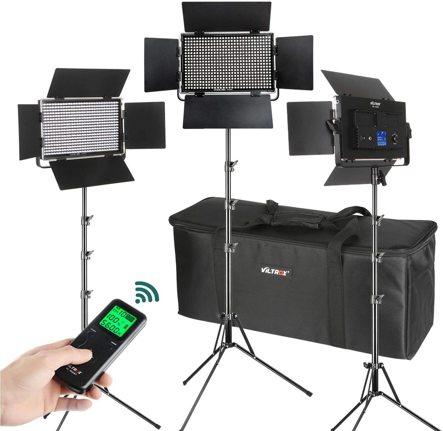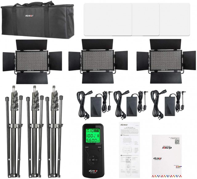 Juego de tres luces Viltrox VL-40T. Luz LED bicolor de alta intensidad de 40 W con temperatura de color ajustable (en el rango de 3300-5600 K) e intensidad regulable (20-100 %; máx. 4400 lm, 2600 lx/1 m). Ofrece la posibilidad de control remoto inalámbrico (2,4 GHz, mando incluido) y la opción de alimentación mediante baterías recargables (NP-F960 / F970, batería no incluida) o fuente de alimentación externa (incluida en el paquete). La configuración de los parámetros se facilita gracias a una pantalla LCD de fácil lectura. Dimensiones: 317 x 249 x 48 mm; peso: 1200 g.