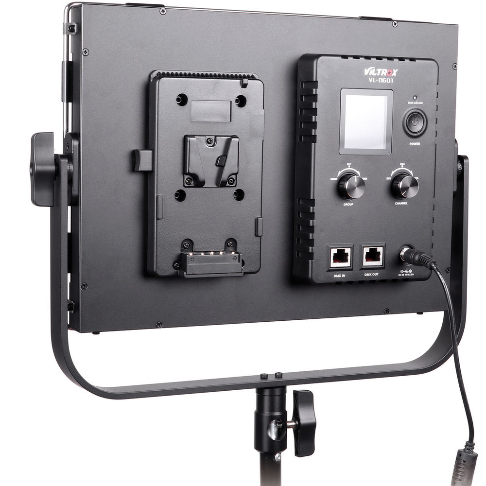 Juego de tres luces Viltrox VL-D60T. Potente luz LED bicolor de 60 W con temperatura de color ajustable (en el rango de 3300-5600 K) e intensidad regulable (20-100 %; máx. 6324 lm, 4350 lx/1 m). Ofrece la posibilidad de control remoto inalámbrico (2,4 GHz, mando incluido) y la opción de alimentación mediante baterías recargables (V-mount, batería no incluida) o fuente de alimentación externa (incluida). La configuración de los parámetros se facilita gracias a una pantalla LCD de fácil lectura. Dimensiones: 320 x 345 x 58 mm; peso: 1900 g.