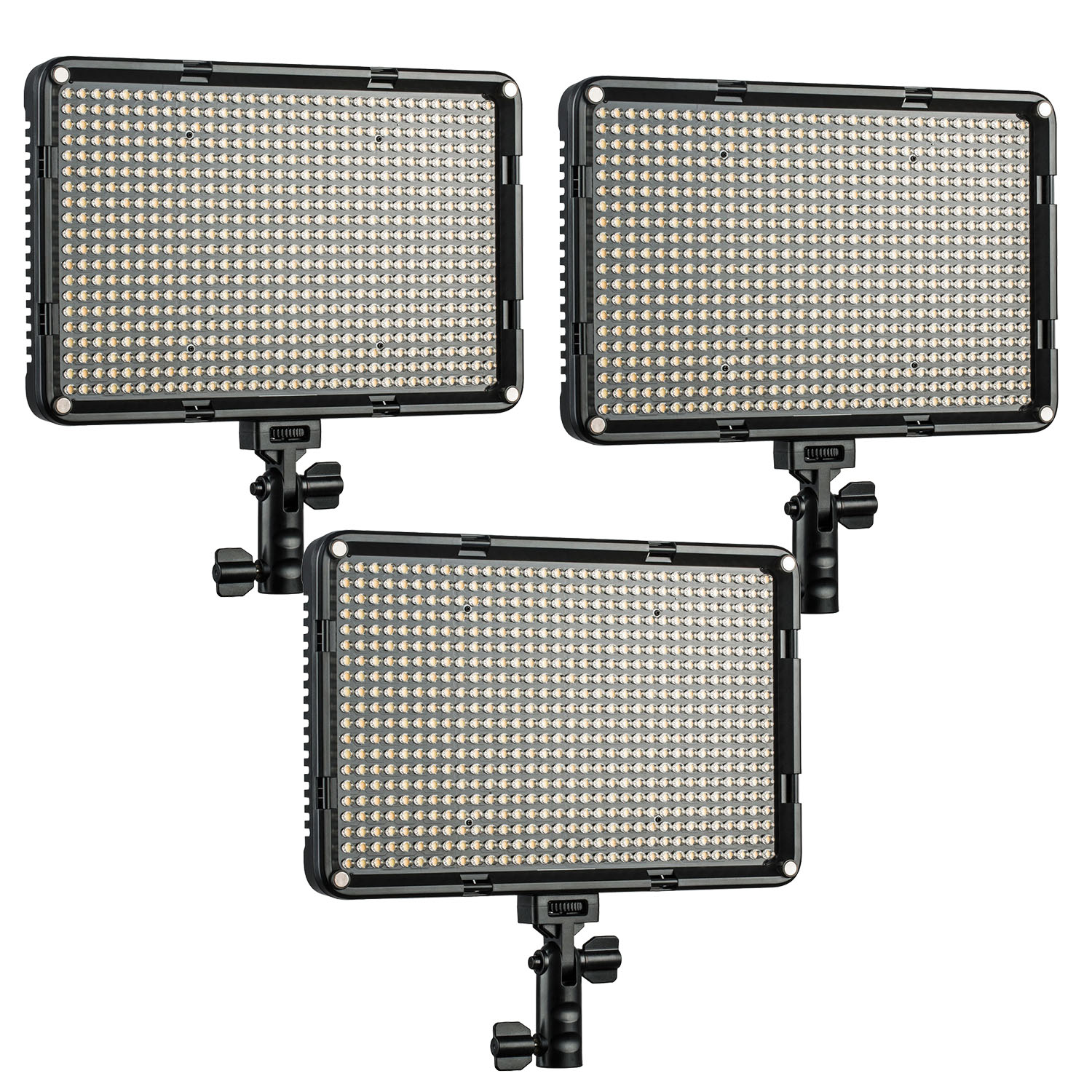 Juego de tres luces Viltrox VL-D640T. Luz LED bicolor de alta intensidad de 45 W con temperatura de color ajustable (en el rango de 3300-5600 K) e intensidad regulable (20-100 %; máx. 4800 lm, 4100 lx/1 m). Ofrece la posibilidad de control remoto inalámbrico (2,4 GHz, mando incluido) y la opción de alimentación mediante baterías recargables (NP-F550 / F570 / F960 / F970, batería no incluida) o fuente de alimentación externa (incluida en el paquete). La configuración de los parámetros se facilita gracias a una pantalla LCD de fácil lectura. Dimensiones: 286 x 190 x 32 mm; peso: 8,5 kg.