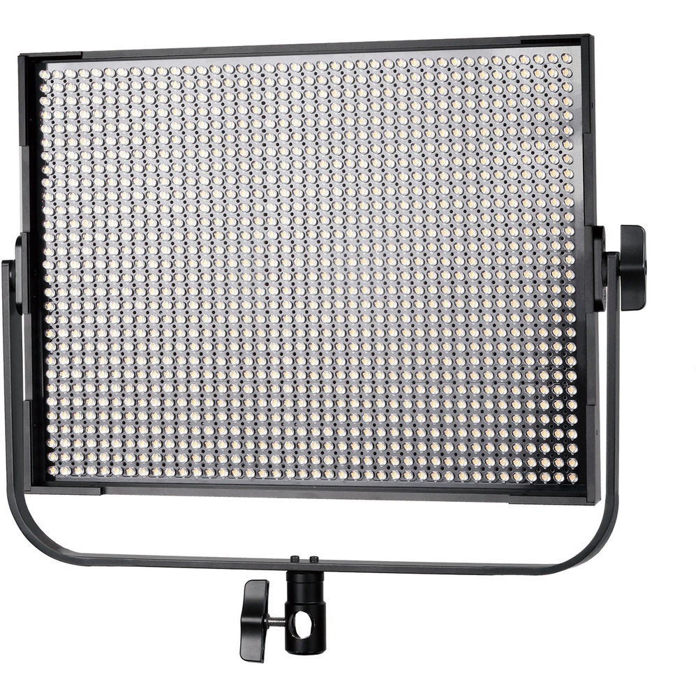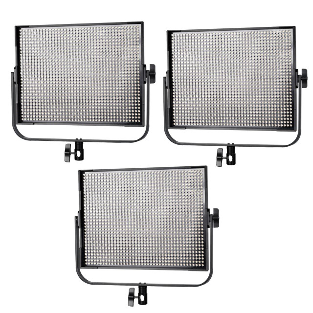 Juego de tres luces Viltrox VL-D85T. Luz LED bicolor de alta intensidad de 85 W con temperatura de color ajustable (en un rango de 3300 a 5600 K) e intensidad regulable (20-100 %; máx. 9300 lm, 7030 lx/1 m). Ofrece la posibilidad de control remoto inalámbrico (2,4 GHz, mando incluido) y la opción de alimentación mediante batería V-mount (batería no incluida) o fuente de alimentación externa (incluida). La configuración de los parámetros se facilita gracias a una pantalla LCD de fácil lectura. Dimensiones: 394 x 364 x 58 mm; peso: 2860 g.