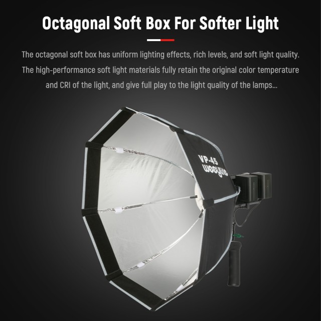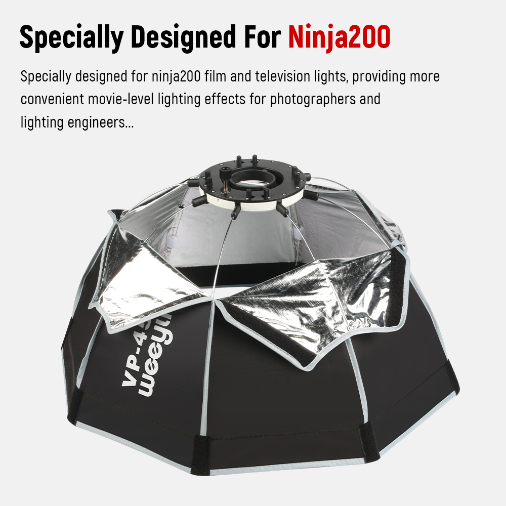 Softbox para el foco LED Viltrox Weeylite Ninja 200. Diámetro: 60 cm; profundidad: 30 cm; peso: 0,41 kg. El paquete incluye una bolsa de transporte (dimensiones plegada: 45 x 17 x 17 cm; peso: 0,79 kg).